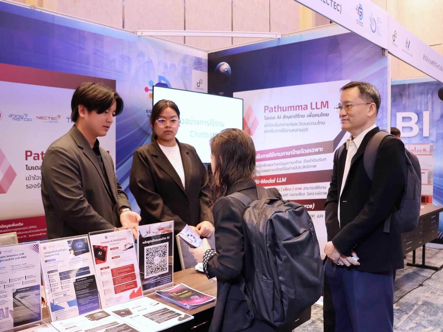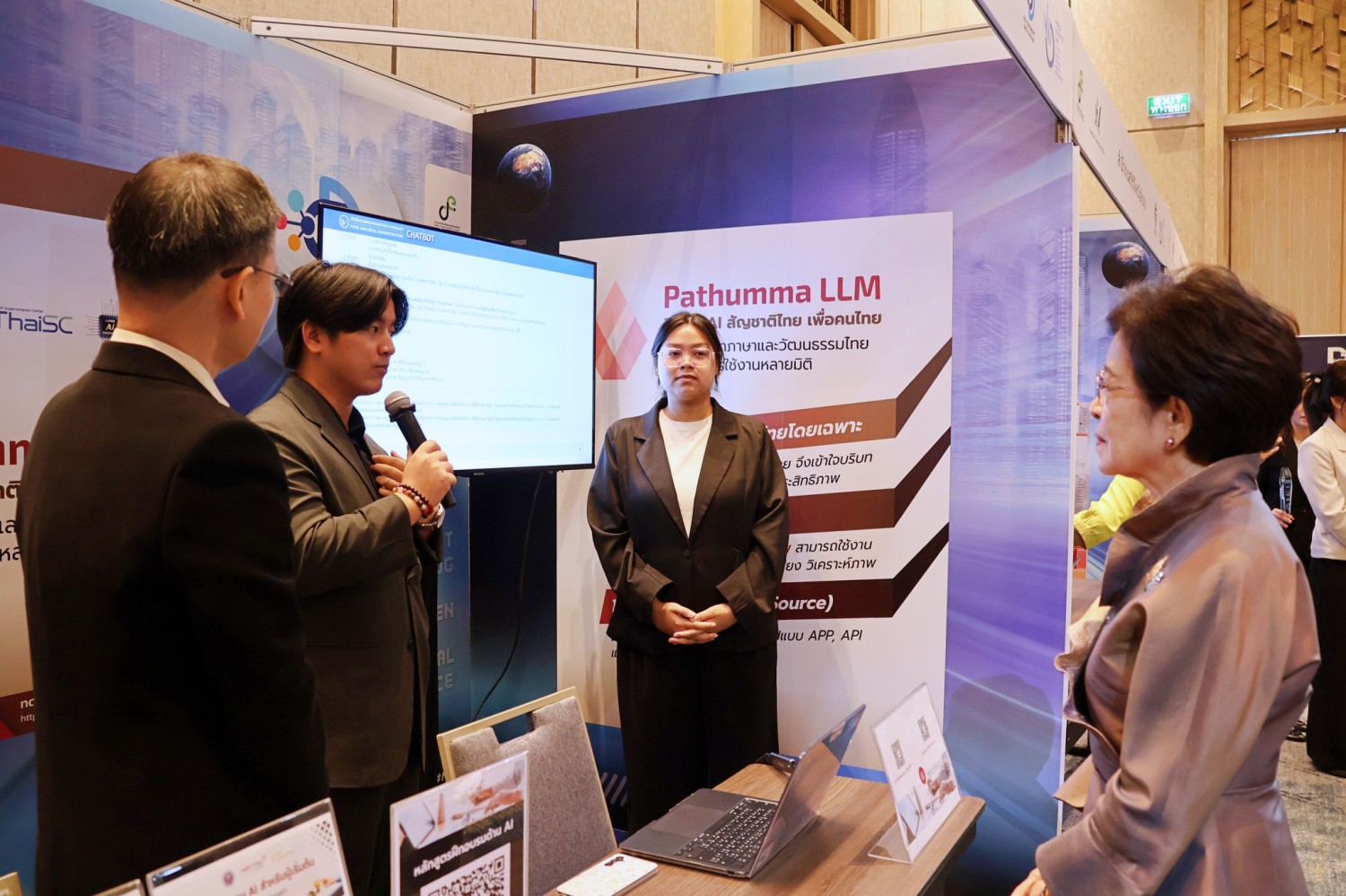 นอกจากนี้ ภายในงานยังมีการจัดแสดง บูธผลงาน Pathumma LLM ซึ่งเป็น โมเดลปัญญาประดิษฐ์สัญชาติไทย ที่พัฒนาโดยทีมวิจัยเนคเทค สวทช. เพื่อสนับสนุนการขับเคลื่อนระบบบริการ AI ของประเทศ โดย Pathumma LLM ได้รับการออกแบบให้รองรับการประมวลผลข้อมูลได้หลากหลายรูปแบบ ทั้ง ข้อความ (Text LLM) สำหรับการตอบคำถามและสนทนาอัตโนมัติ เสียง (Audio LLM) สำหรับการแปลงเสียงพูดเป็นข้อความ (Speech-to-Text) ภาพ (Vision LLM) สำหรับการวิเคราะห์และสร้างคำบรรยายจากภาพ Pathumma LLM สามารถนำไปประยุกต์ใช้งานได้ในหลายด้าน เช่น การให้บริการแชตบอตในภาครัฐและเอกชน การถอดความจากเสียงในการประชุม หรือการสร้างคำบรรยายภาพประกอบในงานวิจัย ซึ่งสะท้อนถึงศักยภาพของเทคโนโลยี AI สัญชาติไทยในการสนับสนุนการใช้ข้อมูลและนวัตกรรมอย่างยั่งยืน