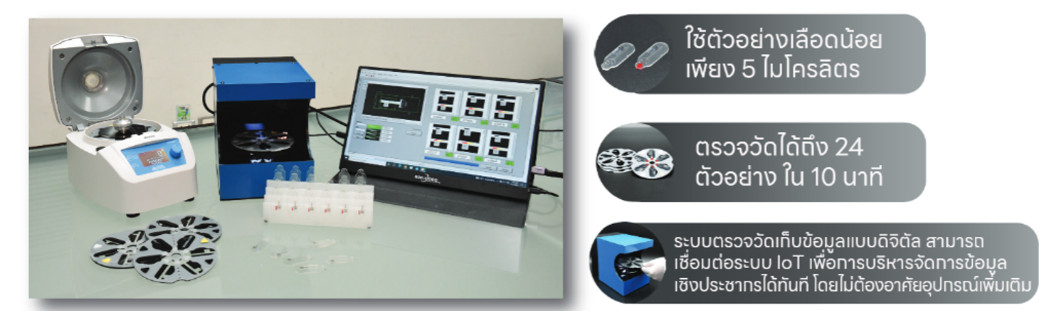 - นำแผ่นไปปั่นแยกเม็ดเลือดแดง มีการออกแบบให้ใช้ความเร็วรอบต่ำในการปั่นแยก ทำให้เครื่องมีขนาดเล็กลง