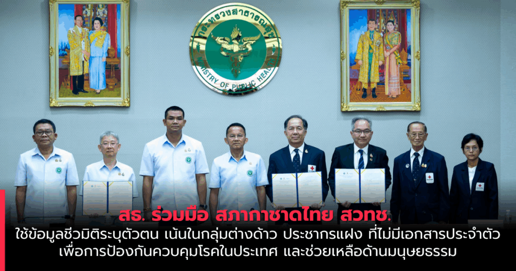 4 กันยายน 2568 ณ สำนักงานปลัดกระทรวงสาธารณสุข จังหวัดนนทบุรี : นายสมศักดิ์ เทพสุทิน รัฐมนตรีว่าการกระทรวงสาธารณสุข เป็นประธานในพิธีบันทึกข้อตกลงความร่วมมือในการประยุกต์ใช้เทคโนโลยีระบุตัวตนของบุคคลที่ไม่มีเอกสารประจำตัวในประเทศไทย เพื่อการสาธารณสุขและช่วยเหลือด้านมนุษยธรรม โดยมีนายแพทย์โอภาส การย์กวินพงศ์ ปลัดกระทรวงสาธารณสุข นายกฤษฎา บุญราช ผู้ช่วยเลขาธิการสภากาชาดไทย และศาสตราจารย์ ดร.ชูกิจ ลิมปิจำนงค์ ผู้อำนวยการสำนักงานพัฒนาวิทยาศาสตร์และเทคโนโลยีแห่งชาติ (สวทช.) เป็นผู้ลงนาม