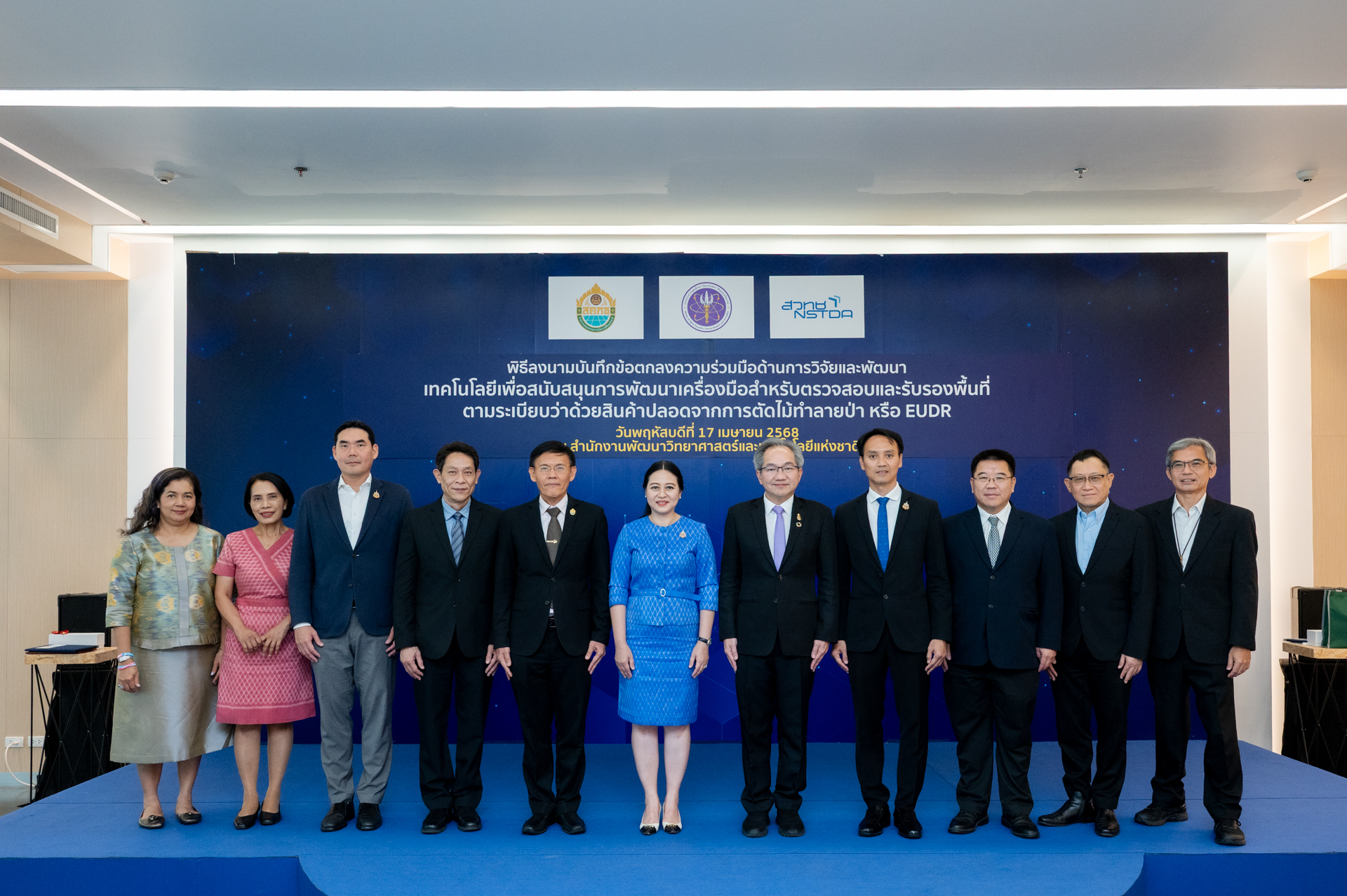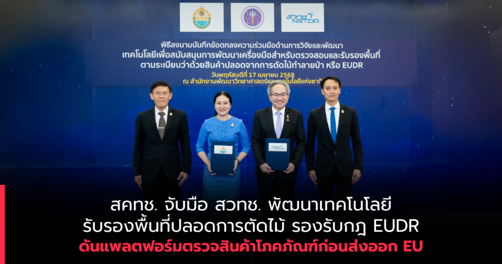 วันที่ 17 เมษายน 2568 ณ ห้องแถลงข่าว ชั้น 1 สำนักงานพัฒนาวิทยาศาสตร์และเทคโนโลยีแห่งชาติ อาคารวิจัยโยธี ถนนพระราม 6 แขวงทุ่งพญาไท เขตราชเทวี กรุงเทพฯ ดร.รวีวรรณ ภูริเดช ผู้อำนวยการสำนักงานคณะกรรมการนโยบายที่ดินแห่งชาติ (สคทช.) และ ศาสตราจารย์ ดร.ชูกิจ ลิมปิจำนงค์ ผู้อำนวยการสำนักงานพัฒนาวิทยาศาสตร์และเทคโนโลยีแห่งชาติ (สวทช.) ได้ร่วมลงนามในบันทึกข้อตกลงความร่วมมือ “ด้านการวิจัยและพัฒนาเทคโนโลยีเพื่อสนับสนุนการพัฒนาเครื่องมือสำหรับตรวจสอบ และรับรองพื้นที่ตามระเบียบว่าด้วยสินค้าที่ปลอดจากการตัดไม้ทำลายป่า หรือ EUDR (EU Regulation on Deforestation-free Products)” ระหว่าง สำนักงานคณะกรรมการนโยบายที่ดินแห่งชาติ (สคทช.) และ สำนักงานพัฒนาวิทยาศาสตร์และเทคโนโลยีแห่งชาติ (สวทช.) ในโอกาสนี้ได้นำแพลตฟอร์มให้บริการตรวจสอบสินค้าที่ปราศจากการทำลายป่า (Deforestation-free Analysis Service Platform) มาแสดงการใช้งานอีกด้วย