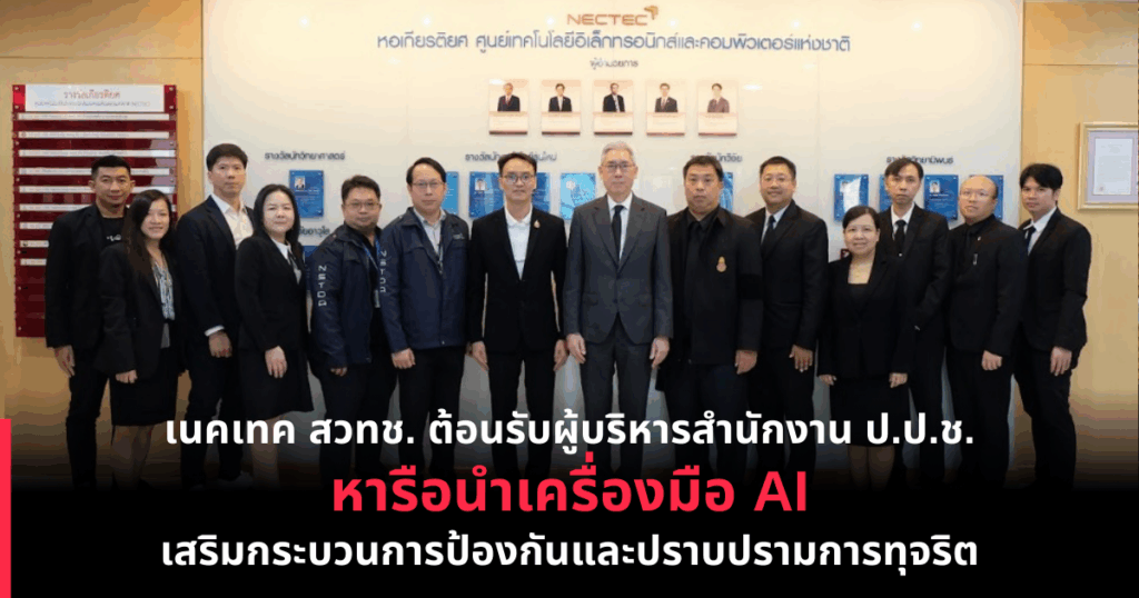 วันที่ 2 ธันวาคม 2568 ดร.ชัย วุฒิวิวัฒน์ชัย ผู้อำนวยการศูนย์เทคโนโลยีอิเล็กทรอนิกส์และคอมพิวเตอร์แห่งชาติ (เนคเทค สวทช.) ได้ให้การต้อนรับ นายนิติพันธุ์ ประจวบเหมาะ รองเลขาธิการคณะกรรมการ ป.ป.ช. พร้อมด้วยผู้บริหารระดับฝ่าย และเจ้าหน้าที่ จำนวน 8 ท่าน ที่ได้เดินทางมาเยี่ยมชม พร้อมร่วมหารือแนวทางการนำเทคโนโลยีดจิทัล และเครื่องมือ AI ไปประยุกต์ใช้สนับสนุนภารกิจของสำนักงาน ป.ป.ช. ให้มีประสิทธิภาพสูงสุดในการตรวจสอบ ไต่สวน ติดตามทรัพย์สิน นำผู้กระทำความผิดมารับบทลงโทษตามกระบวนการยุติธรรม เพื่อควบคุมการทุจริต ลดปัญหาอาชญากรรม โดยมี ดร.ศวิต กาสุริยะ รองผู้อำนวยการ เนคเทค สวทช. และคณะนักวิจัยกลุ่มวิจัยปัญญาประดิษฐ์ ร่วมให้การต้อนรับ