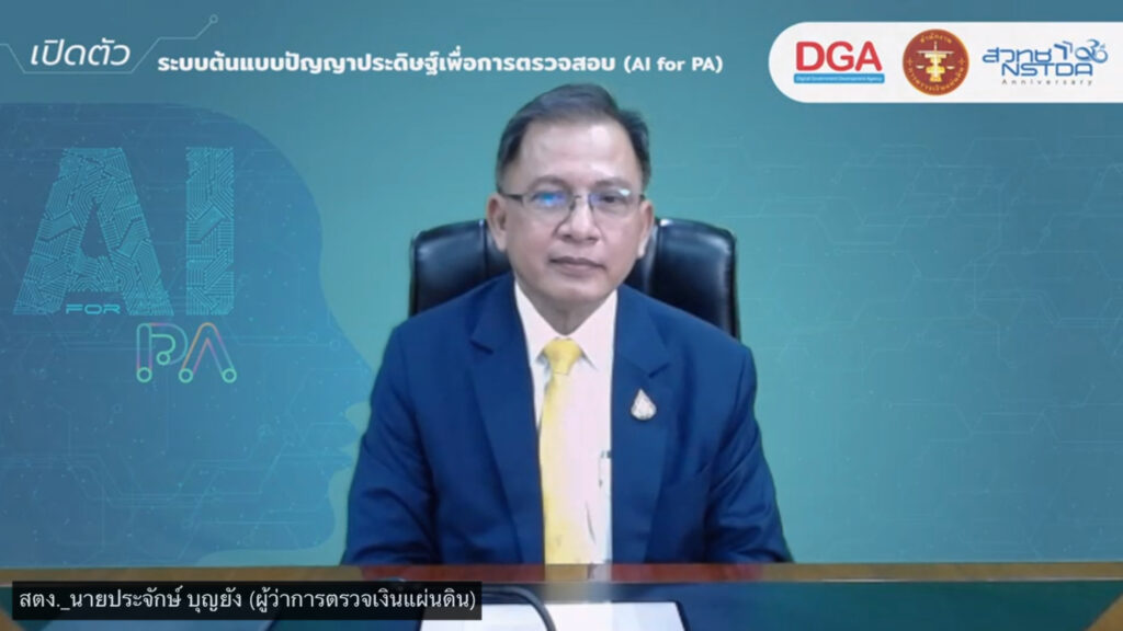 “AI for PA เป็นโครงการความร่วมมือเพื่อการพัฒนาแพลตฟอร์มต้นแบบปัญญาประดิษฐ์เพื่อช่วยในการวิเคราะห์สืบค้นข้อมูลจากฐานข้อมูลงานตรวจสอบของ สตง. โดยอาศัยข้อมูลย้อนหลังมากกว่า 20 ปี ซึ่งเป็นเอกสารจำนวนหลายหมื่นฉบับ เทคโนโลยีปัญญาประดิษฐ์หรือ AI ที่ถูกนำมาใช้งานเป็น AI ทางด้านการประมวลผลภาษาหรือที่เรียกว่า Natural Language Processing โดยเป็นการนำมาประยุกต์ใช้สำหรับการพัฒนาระบบค้นหาและวิเคราะห์ข้อมูลโดยดูจากบริบทและความเชื่อมโยงของเนื้อหา ซึ่งจากการใช้เทคโนโลยี AI ดังกล่าวจะช่วยทบทวนข้อมูลได้รวดเร็วขึ้น มองอย่างเป็นแบบแผน เพิ่มความแม่นยำและความรวดเร็วในการเข้าถึงข้อมูลที่ค้นหา และค้นพบความความสัมพันธ์ระหว่างจุดของข้อมูลที่ถูกมองข้ามไป ความสัมพันธ์ที่จะแนะนำเส้นทางไปสู่การค้นหาในขั้นตอนต่อไป และเป็นเครื่องมือที่ช่วยในกระบวนการเตรียมงานตรวจสอบ และตั้งคำถามการตรวจสอบของ สตง. ให้สะดวกรวดเร็วและช่วยพัฒนาระบบงานในปัจจุบันและอนาคตให้กับเจ้าหน้าที่ผู้ปฏิบัติงานของ สตง.”