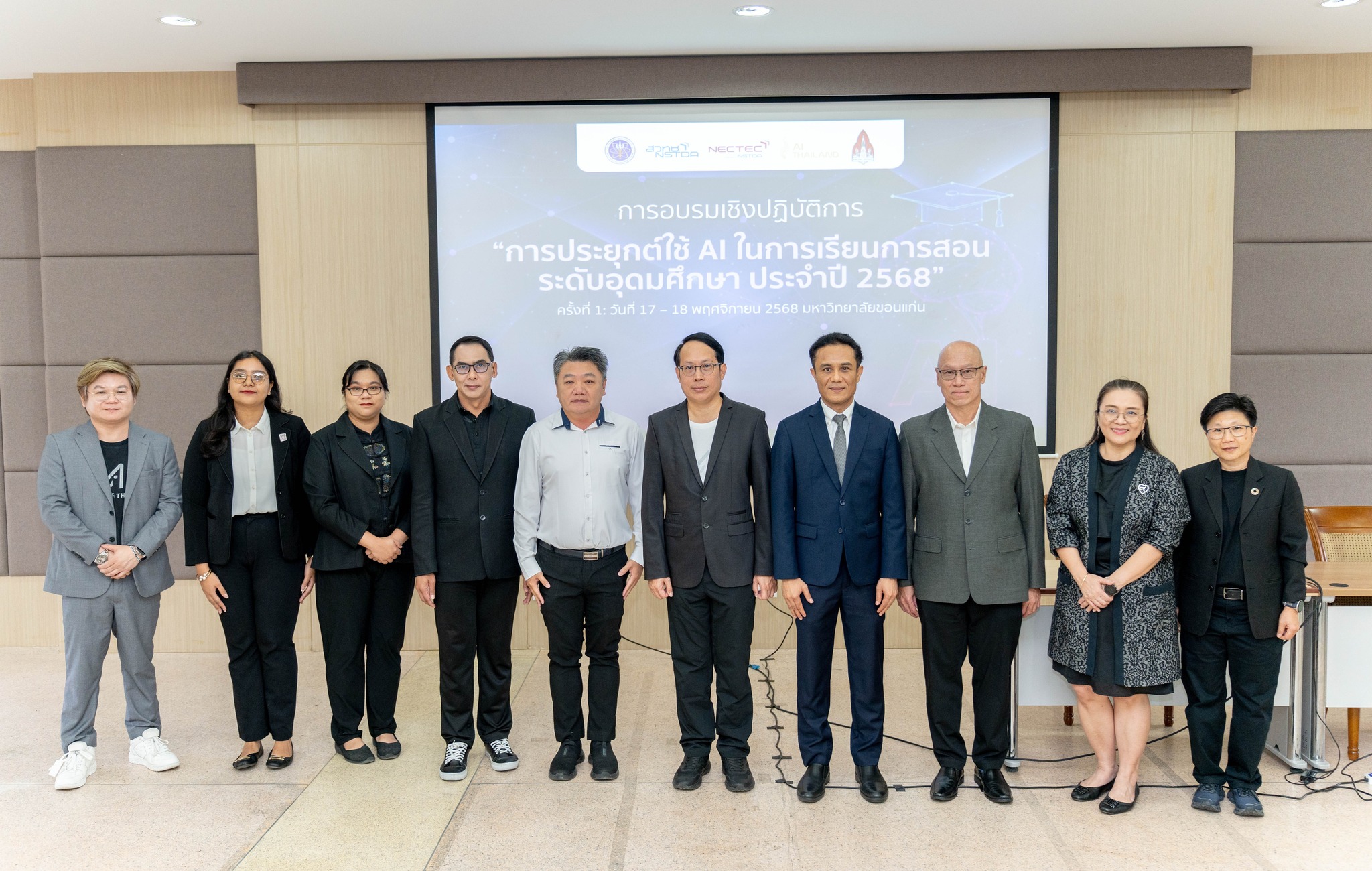 สำนักปลัดกระทรวงการอุดมศึกษา วิทยาศาสตร์ วิจัยและนวัตกรรม (สป.อว.) ร่วมกับสำนักงานพัฒนาวิทยาศาสตร์และเทคโนโลยีแห่งชาติ (สวทช.) โดยศูนย์เทคโนโลยีอิเล็กทรอนิกส์และคอมพิวเตอร์แห่งชาติ (เนคเทค) จึงได้ดำเนินโครงการฝึกอบรมสร้างความตระหนักรู้การใช้ปัญญาประดิษฐ์ในการเรียนการสอนระดับอุดมศึกษา จัดกิจกรรมอบรมเชิงปฏิบัติการ “การประยุกต์ใช้ AI เพื่อการเรียนการสอนระดับอุดมศึกษา” ประจำปี 2568 มุ่งยกระดับศักยภาพบุคลากรการศึกษาในสถาบันอุดมศึกษาสังกัดกระทรวงอว. ทั้งภาครัฐ และเอกชน ใน 5 ภูมิภาคทั่วประเทศ ได้เพิ่มพูนความรู้ สร้างความเข้าใจ และได้พัฒนาทักษะการใช้ AI เป็นเครื่องมือช่วยออกแบบการเรียนการสอนรูปแบบใหม่ให้แก่นักศึกษาในสาขาวิชาต่างๆ โดยเปิดตัวการจัดกิจกรรมอบรมฯ ครั้งแรก ในระหว่างวันที่ 17-18 พฤศจิกายน 2568 ณ มหาวิทยาลัยขอนแก่น จังหวัดขอนแก่น ได้รับเกียรติจาก ผู้ช่วยศาสตราจารย์ ดร. เด่นพงษ์ สุดภักดี รองอธิการบดีฝ่ายการศึกษาและดิจิทัล มหาวิทยาลัยขอนแก่น กล่าวต้อนรับ และ ดร.ศวิต กาสุริยะ รองผู้อำนวยการ เนคเทค สวทช. กล่าวถึงความเป็นมาของโครงการ พร้อมกล่าวเปิดการอบรมฯ โดยมีผู้บริหาร อาจารย์ จาก 31 สถาบันระดับอุดมศึกษา กว่า 120 ท่าน จากภาคตะวันออกเฉียงเหนือ และพื้นที่จังหวัดใกล้เคียง เข้าร่วมกิจกรรม