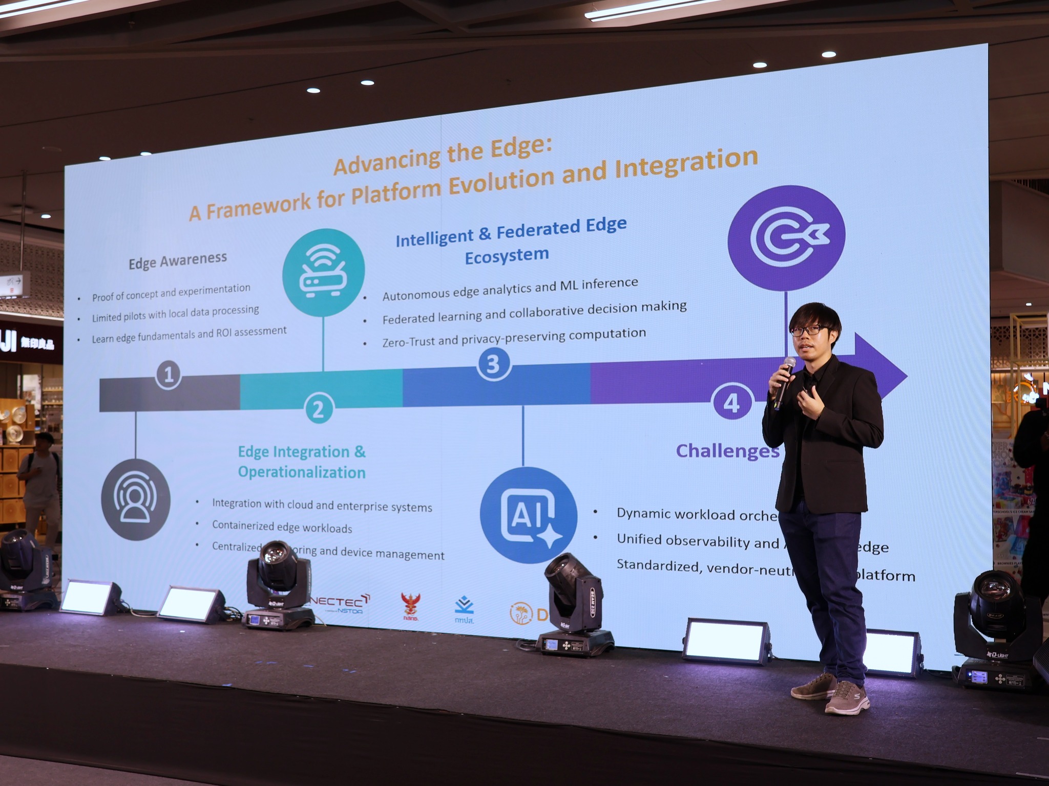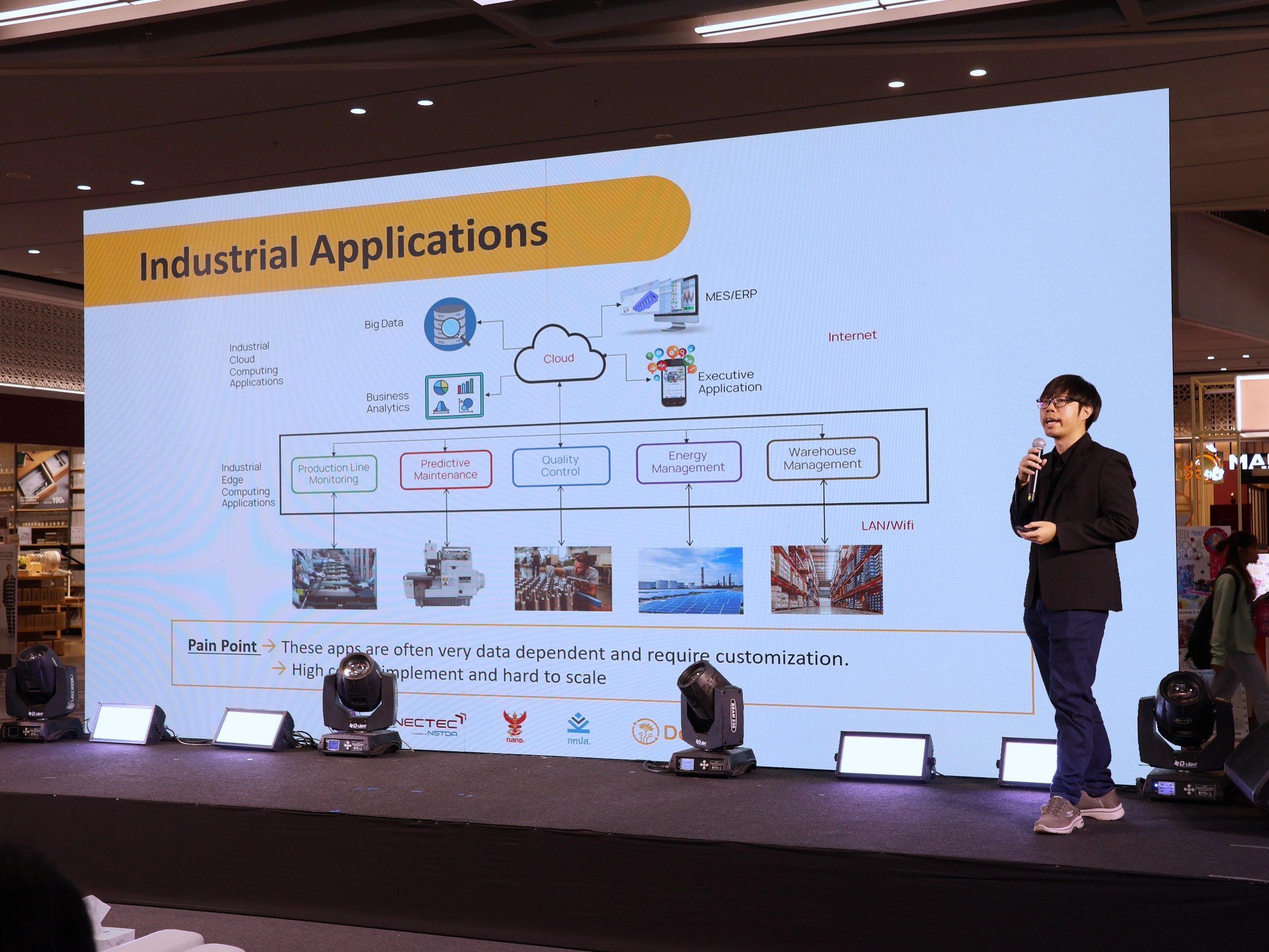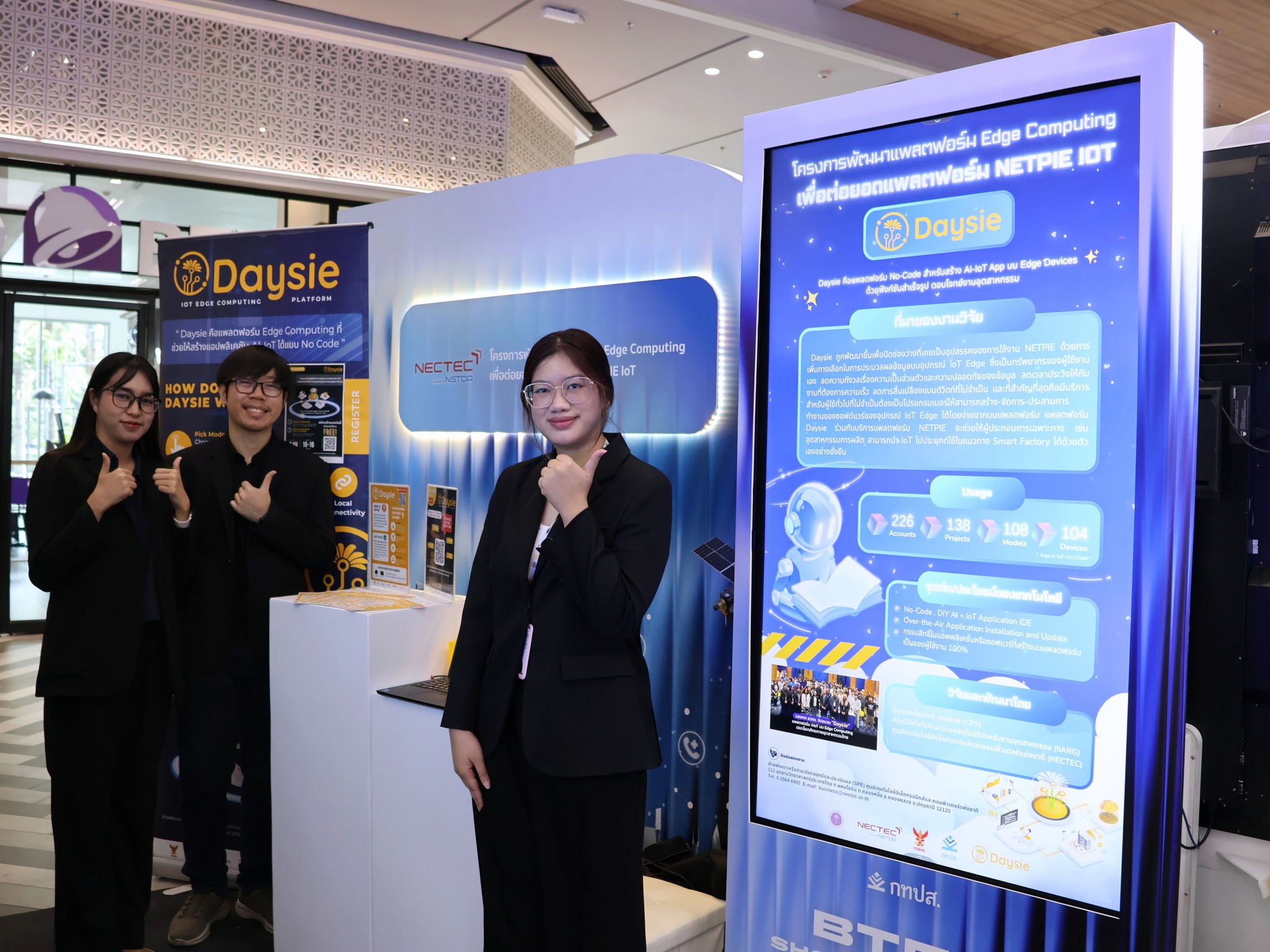 โครงการพัฒนาแพลตฟอร์ม Edge Computing เพื่อต่อยอดแพลตฟอร์ม NETPIE IoT Daysie คือแพลตฟอร์ม No-Code สำหรับสร้าง AI-IoT Applications บน Edge Devices ด้วยฟังก์ชันสำเร็จรูป ตอบโจทย์การใช้งานภาคอุตสาหกรรม Daysie ถูกพัฒนาขึ้นเพื่อแก้ข้อจำกัดของ NETPIE ด้วยการเพิ่มความสามารถประมวลผลบนอุปกรณ์ IoT Edge ของผู้ใช้งาน ช่วยลดภาระด้านความปลอดภัย ความต่อเนื่อง และความเร็วในการทำงาน ลดความเสี่ยงจากความล่าช้า และลดต้นทุนแบนด์วิธอินเทอร์เน็ต ด้วยระบบ No-Code ผู้ใช้งานทั่วไปสามารถสร้าง จัดการ และติดตั้งแอปพลิเคชัน IoT Edge ได้อย่างง่ายดาย พร้อมรองรับการทำงานร่วมกับ NETPIE เพื่อขับเคลื่อนการประยุกต์ใช้ IoT ในอุตสาหกรรมเกษตรและการผลิต สู่การทำงานแบบ Smart Factory อย่างมีประสิทธิภาพและยั่งยืน จุดเด่น / ประโยชน์ของเทคโนโลยี 1) รองรับ No-Code และ DIY AI + IoT Application IDE 2) ติดตั้งและอัปเดตแอปผ่านระบบ Over-the-Air (OTA) 3) ประมวลผลบนอุปกรณ์ของผู้ใช้งาน 100%