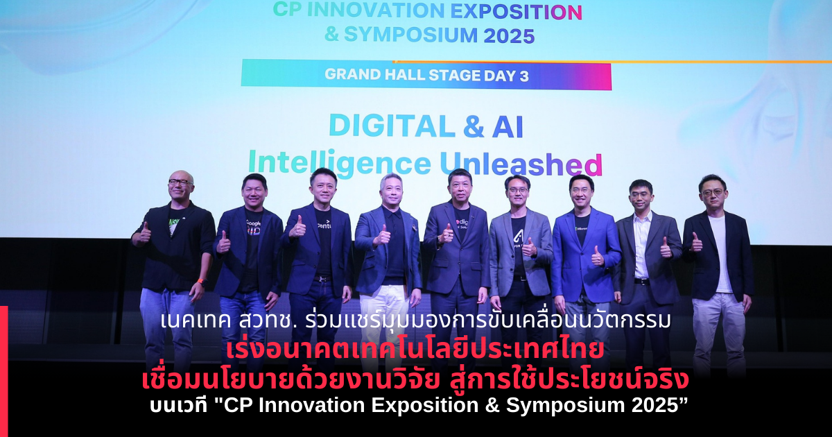 เนคเทค สวทช. ร่วมแชร์มุมมองการขับเคลื่อนนวัตกรรม เร่งอนาคตเทคโนโลยีประเทศไทย เชื่อมนโยบายด้วยงานวิจัย สู่การใช้ประโยชน์จริง บนเวที “CP Innovation Exposition & Symposium 2025”