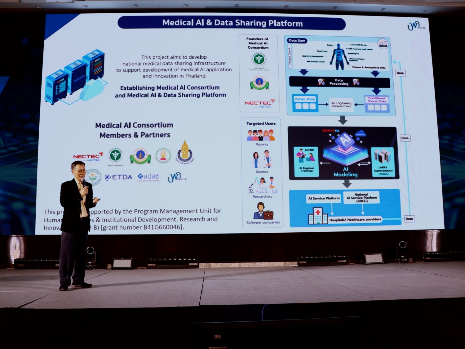 นอกจากนี้ ภายในงานยังมีการจัดแสดง บูธผลงาน Pathumma LLM ซึ่งเป็น โมเดลปัญญาประดิษฐ์สัญชาติไทย ที่พัฒนาโดยทีมวิจัยเนคเทค สวทช. เพื่อสนับสนุนการขับเคลื่อนระบบบริการ AI ของประเทศ โดย Pathumma LLM ได้รับการออกแบบให้รองรับการประมวลผลข้อมูลได้หลากหลายรูปแบบ ทั้ง ข้อความ (Text LLM) สำหรับการตอบคำถามและสนทนาอัตโนมัติ เสียง (Audio LLM) สำหรับการแปลงเสียงพูดเป็นข้อความ (Speech-to-Text) ภาพ (Vision LLM) สำหรับการวิเคราะห์และสร้างคำบรรยายจากภาพ Pathumma LLM สามารถนำไปประยุกต์ใช้งานได้ในหลายด้าน เช่น การให้บริการแชตบอตในภาครัฐและเอกชน การถอดความจากเสียงในการประชุม หรือการสร้างคำบรรยายภาพประกอบในงานวิจัย ซึ่งสะท้อนถึงศักยภาพของเทคโนโลยี AI สัญชาติไทยในการสนับสนุนการใช้ข้อมูลและนวัตกรรมอย่างยั่งยืน