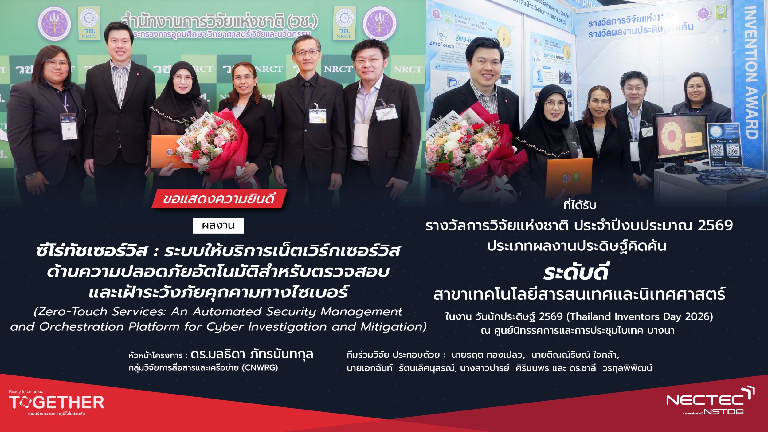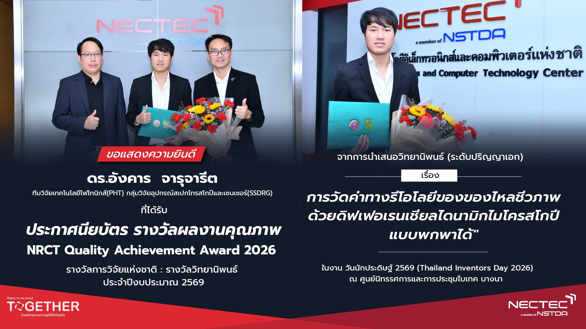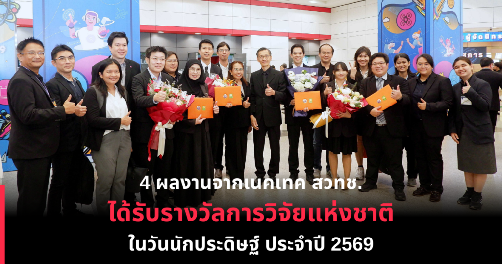 ในปี 2569 นี้ มีนักวิจัยจากสำนักงานพัฒนาวิทยาศาสตร์และเทคโนโลยีแห่งชาติ (สวทช.) เข้ารับรางวัลการวิจัยแห่งชาติ ประจำปีงบประมาณ 2569 รวมทั้งสิ้น 42 รางวัล โดยเป็นผลงานจากศูนย์เทคโนโลยีอิเล็กทรอนิกส์และคอมพิวเตอร์แห่งชาติ (เนคเทค) จำนวน 4 รางวัล โอกาสนี้ ดร.สมบุญ สหสิทธิวัฒน์ รองผู้อำนวยการ สวทช. พร้อมผู้แทนคณะผู้บริหาร ร่วมแสดงความยินดีกับนักวิจัยภายใต้สังกัด สวทช. ที่ได้รับรางวัล โดย นางสาวสิรินทร อินทร์สวาท รองผู้อำนวยการเนคเทคเข้าร่วมแสดงความยินดีกับนักวิจัยและทีมวิจัยเนคเทค ทั้ง 4 ผลงานที่ได้รับรางวัลดังกล่าว ดังนี้
