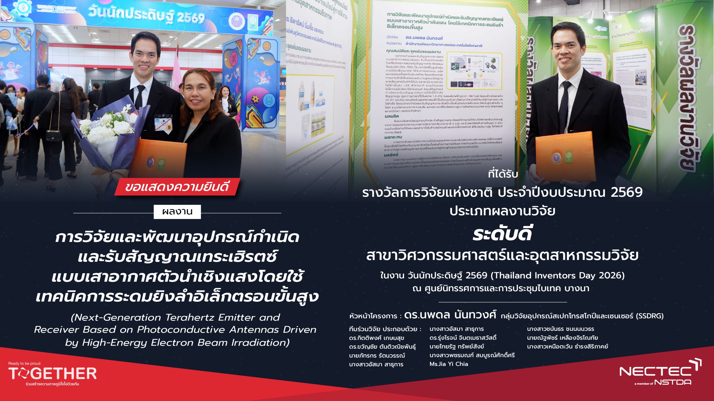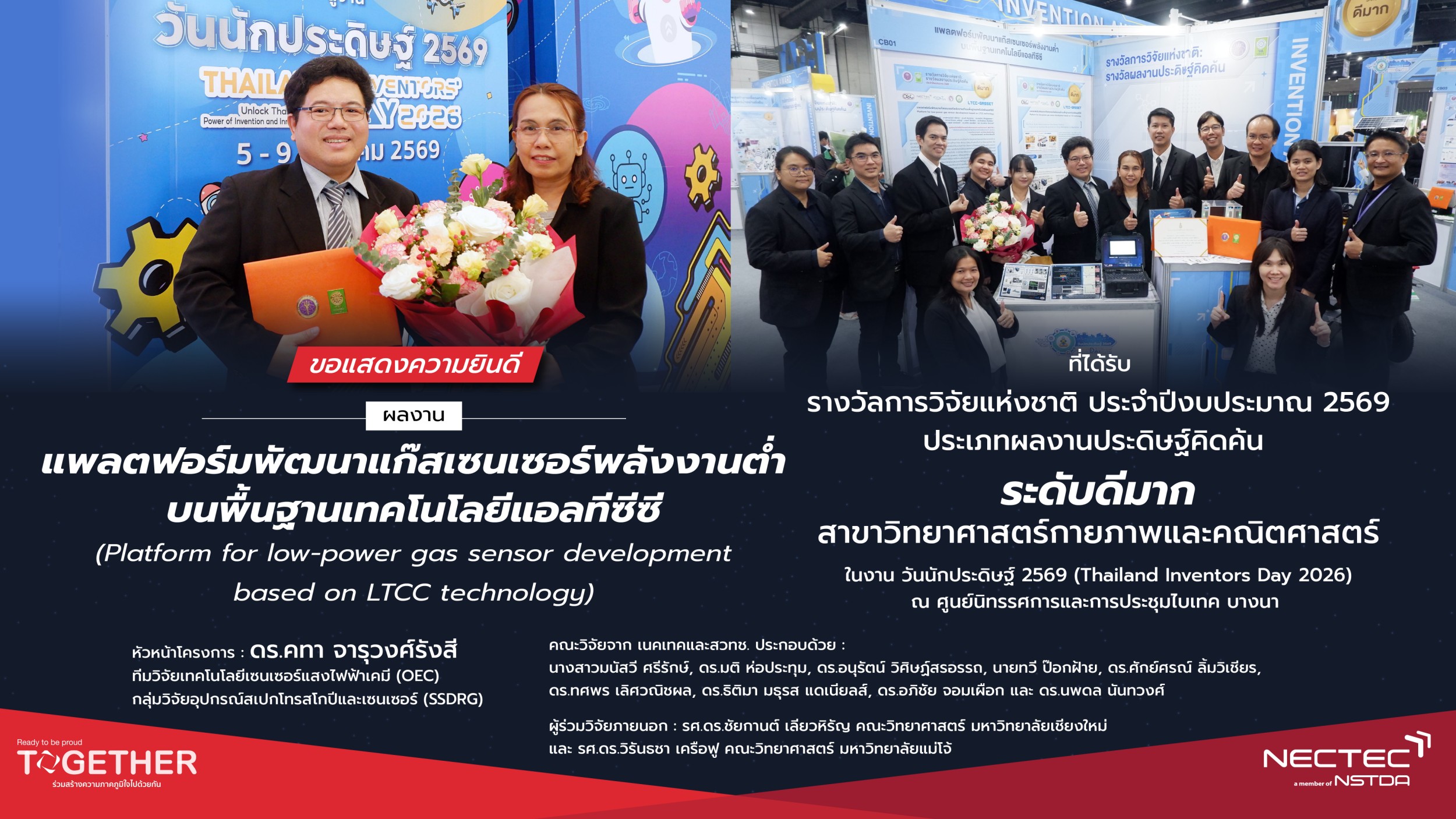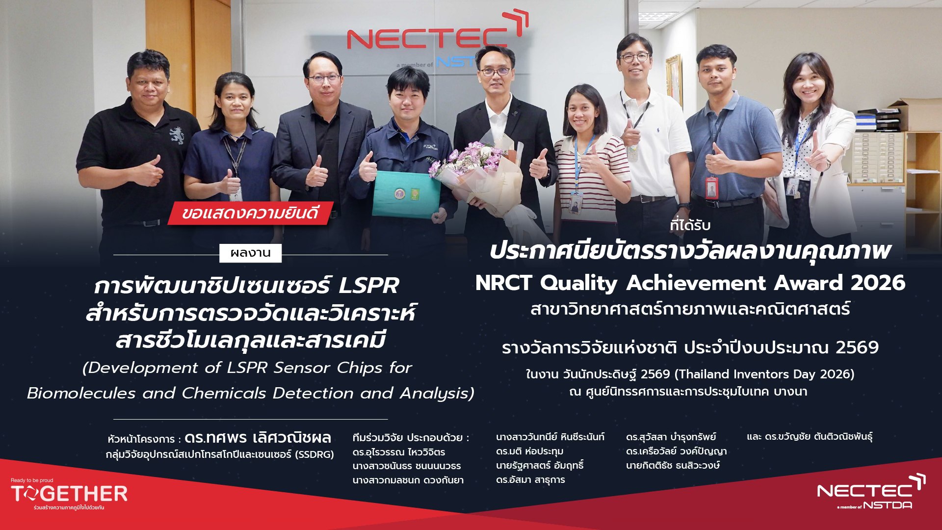 ในปี 2569 นี้ มีนักวิจัยจากสำนักงานพัฒนาวิทยาศาสตร์และเทคโนโลยีแห่งชาติ (สวทช.) เข้ารับรางวัลการวิจัยแห่งชาติ ประจำปีงบประมาณ 2569 รวมทั้งสิ้น 42 รางวัล โดยเป็นผลงานจากศูนย์เทคโนโลยีอิเล็กทรอนิกส์และคอมพิวเตอร์แห่งชาติ (เนคเทค) จำนวน 4 รางวัล โอกาสนี้ ดร.สมบุญ สหสิทธิวัฒน์ รองผู้อำนวยการ สวทช. พร้อมผู้แทนคณะผู้บริหาร ร่วมแสดงความยินดีกับนักวิจัยภายใต้สังกัด สวทช. ที่ได้รับรางวัล โดย นางสาวสิรินทร อินทร์สวาท รองผู้อำนวยการเนคเทคเข้าร่วมแสดงความยินดีกับนักวิจัยและทีมวิจัยเนคเทค ทั้ง 4 ผลงานที่ได้รับรางวัลดังกล่าว ดังนี้
