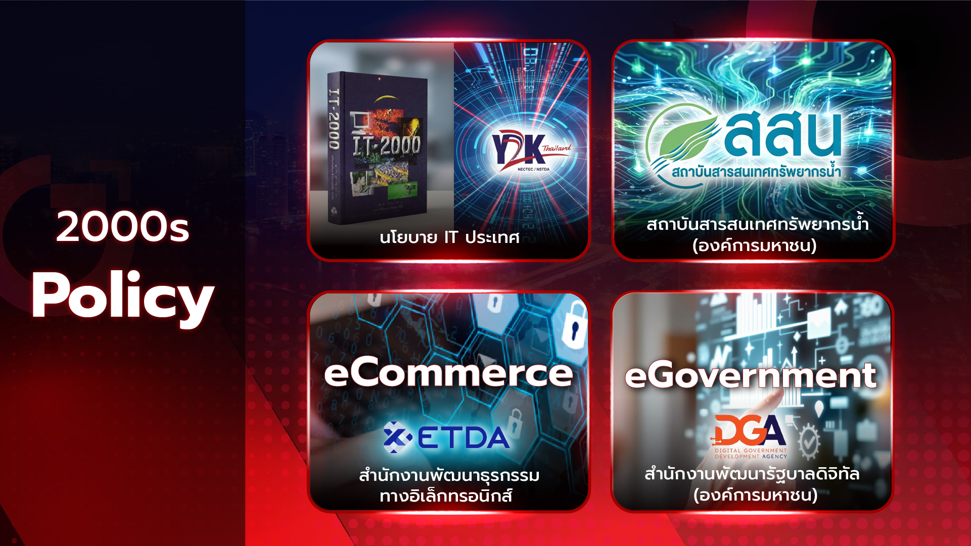 ควบคู่ไปกับการชี้นำการพัฒนา IT ของประเทศ อาทิ แผนแม่บท IT แห่งชาติ ไปจนถึงการพัฒนาพาณิชย์อิเล็กทรอนิกส์ (พ.ร.บ. ว่าด้วยธุรกรรมทางอิเล็กทรอนิกส์) นำไปสู่การก่อตั้งสำนักงานพัฒนาธุรกรรมทางอิเล็กทรอนิกส์ (ETDA) และสำนักงานพัฒนารัฐบาลดิจิทัล (DGA)