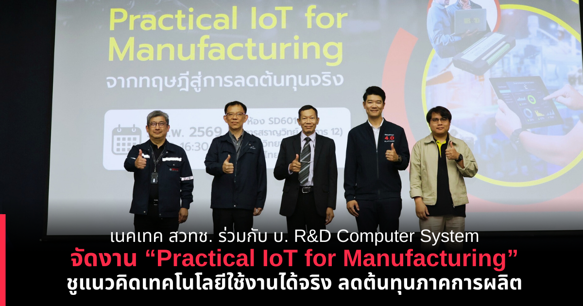 เมื่อวันที่ 9 กุมภาพันธ์ 2569 เนคเทค สวทช. โดย ศูนย์นวัตกรรมการผลิตยั่งยืน (SMC) ร่วมกับ บริษัท R&D Computer System จัดกิจกรรม “Practical IoT for Manufacturing: จากทฤษฎีสู่การลดต้นทุนจริง” ณ ห้อง SD-601 อาคารสราญวิทย์ อุทยานวิทยาศาสตร์ประเทศไทย จังหวัดปทุมธานี กิจกรรมจัดขึ้นภายใต้แนวคิด “Partnership & Practicality” มุ่งเน้นการสร้างความร่วมมือระหว่างหน่วยงานวิจัยและภาคอุตสาหกรรม เพื่อผลักดันการประยุกต์ใช้เทคโนโลยี IoT ที่สามารถนำไปใช้งานได้จริงในภาคการผลิต ช่วยลดต้นทุน เพิ่มประสิทธิภาพ และสนับสนุนการเปลี่ยนผ่านสู่ Smart Factory อย่างเป็นรูปธรรม