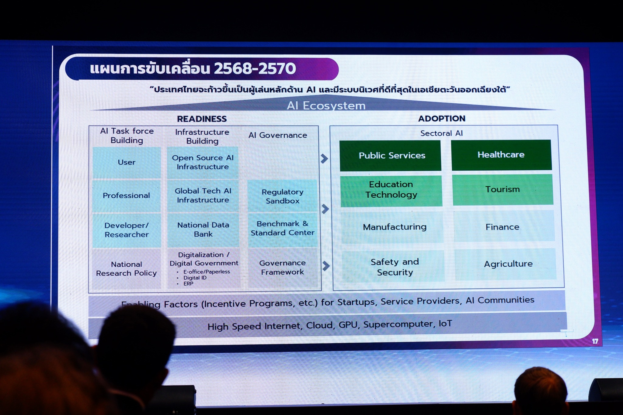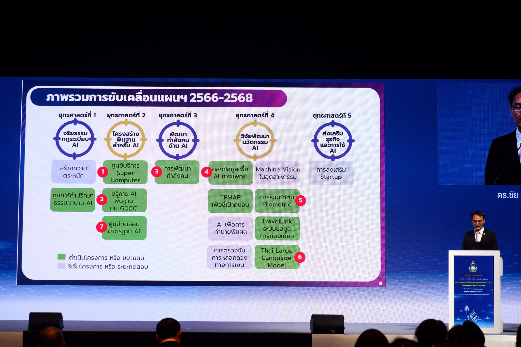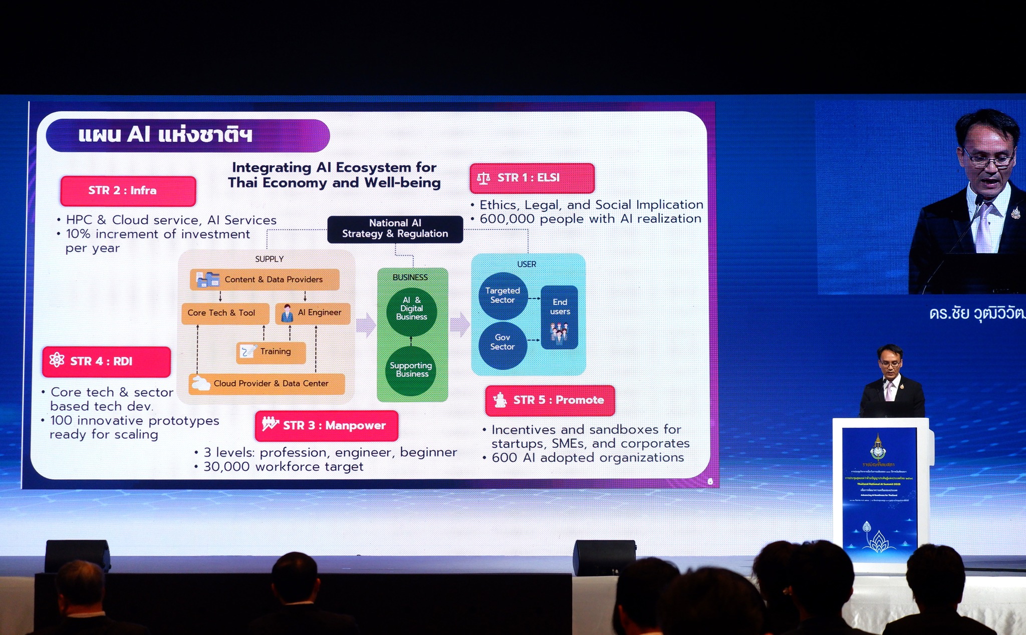 การขับเคลื่อนแผนในระยะต่อไป (พ.ศ. 2568 – 2570) ยังคงเน้นการพัฒนากำลังคนในทุกระดับตั้งแต่การศึกษาขั้นพื้นฐานไปจนถึงระดับวิชาชีพ การดึงดูดการสงทุน้าโครงสร้างพื้นฐานเพิ่มขึ้นเพื่อส่งเสริมระบบนิเวศปัญญาประดิษฐ์ และการพัฒนาปัญญาประดิษฐ์เพื่อประยุกต์ใช้ในภาครัฐ และภาคธุรกิจอุตสาหกรรมสำคัญ อาทิ การแพทย์และสุขภาวะ การศึกษา และเกษตรกรรม โดยอาศัยการทำงานร่วมกันของหน่วยงานที่เกี่ยวข้อง เพื่อให้ประเทศไทยก้าวขึ้นเป็นผู้เล่นหลักด้าน AI และมีระบบนิเวศที่ดีที่สุดในเอเชียตะวันออกเฉียงใต้: ดร.ชัย กล่าวในการบรรยาย
