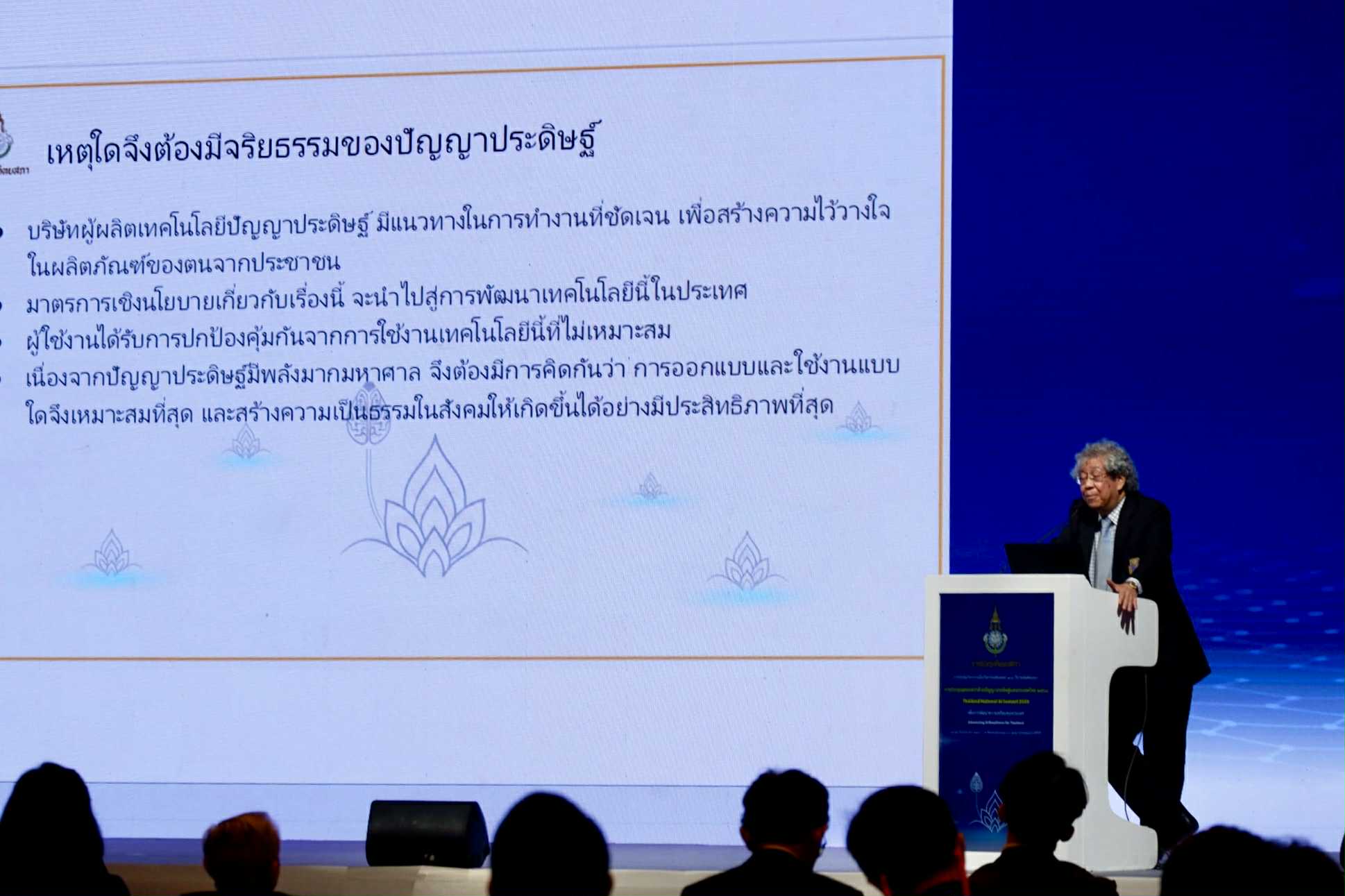 ต่อเนื่องด้วยการเสวนาภายใต้หัวข้อ “การประยุกต์ปัญญาประดิษฐ์ในบริบทของประเทศไทย” โดยมี ศาสตราจารย์เกียรติคุณ นายแพทย์สุรพล อิสรไกรศีล นายกราชบัณฑิตยสภา เป็นประธานการเสวนา ซึ่งได้นำเสนอตัวอย่างการใช้ AI ที่สอดคล้องกับบริบทไทย ทั้งทางด้านธุรกิจอุตสาหกรรม ศาสนา กระบวนการยุติธรรม ได้แก่