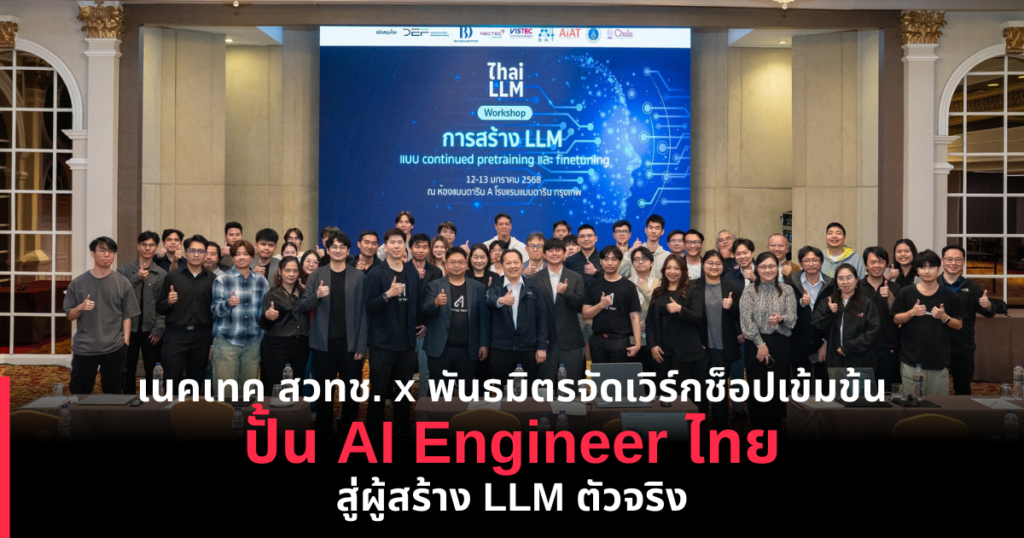 เนคเทค สวทช. ร่วมหน่วยงานพันธมิตรภายใต้โครงการพัฒนา ThaiLLM เปิดโอกาสครั้งสำคัญ จัดเวิร์กช็อปเข้มข้น 3 วันเต็ม ปั้น AI Engineer ไทย สู่ผู้สร้าง LLM ตัวจริง ในการอบรมเชิงปฏิบัติการหลักสูตร “การสร้าง LLM แบบ Continued Pretraining และ Fine-tuning” ซึ่งได้จัดขึ้นเมื่อวันที่ 11-13 มกราคม 2569 ทั้งในรูปแบบ Online และ Onsite เจาะลึกตั้งแต่การเตรียมข้อมูล การดึงข้อมูล การทำความสะอาดข้อมูลตามหลัก PDPA ไปจนถึงการเทรน และปรับแต่งโมเดลภาษาขนาดใหญ่ เพื่อต่อยอดการใช้งานจริงในองค์กร พร้อมสิทธิในการใช้งาน Lanta Supercomputer ของสวทช. โดยมี ดร.เทพชัย ทรัพย์นิธิ นักวิจัยอาวุโส กลุ่มวิจัยปัญญาประดิษฐ์ เนคเทค สวทช. กล่าวเปิดงาน และผู้เข้าร่วมอบรมจากหน่วยงานภาครัฐ ภาคเอกชน สถาบันการศึกษา จำนวนกว่า 30 คน