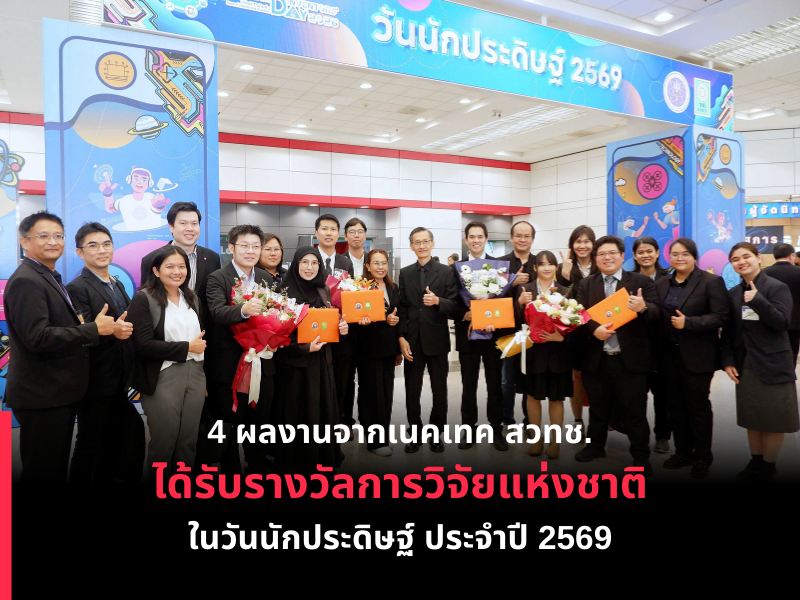 ผลงานจากเนคเทค สวทช. ได้รับรางวัลการวิจัยแห่งชาติ ในวันนักประดิษฐ์ ประจำปี 2569 รางวัลการวิจัยแห่งชาติ รางวัลนักวิจัยดีเด่นแห่งชาติ รางวัลผลงานวิจัย รางวัลวิทยานิพนธ์ และรางวัลผลงานประดิษฐ์คิดค้น