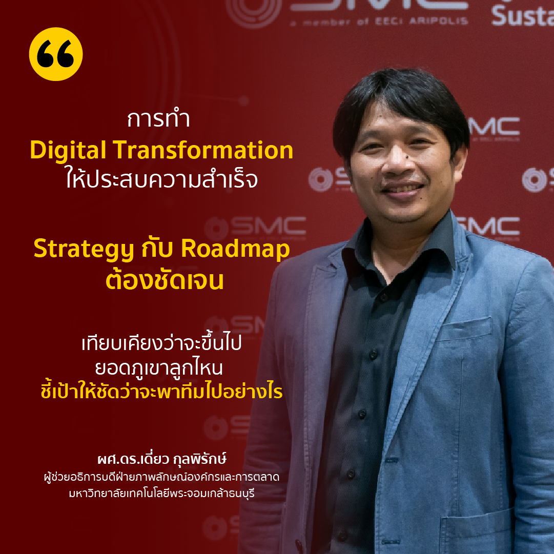 “ ‘Digital Transformation’ เปรียบเสมือนเส้นทางไปสู่ อุตสาหกรรม 4.0” ผศ. ดร.เดี่ยว กุลพิรักษ์ ผู้ช่วยอธิการบดีฝ่ายภาพลักษณ์องค์กรและการตลาด และอาจารย์ประจำ ภาควิชาวิศวกรรมระบบควบคุมและเครื่องมือวัด คณะวิศวกรรมศาสตร์ มหาวิทยาลัยเทคโนโลยีพระจอมเกล้าธนบุรี กล่าวในเสวนา Factors for a Successful Digital Manufacturing Transformation ร่วมกับ คุณนัธทวัฒน์ ศรีเลิศรักษ์, Distribution Center Manager บริษัท IDS Medical Systems (Thailand) จำกัด ดำเนินการเสวนาโดย ดร.พรพรหม อธีตนันท์ รองผู้อำนวยการฝ่ายกลยุทธ์วิจัยและถ่ายทอดเทคโนโลยี เนคเทค สวทช.