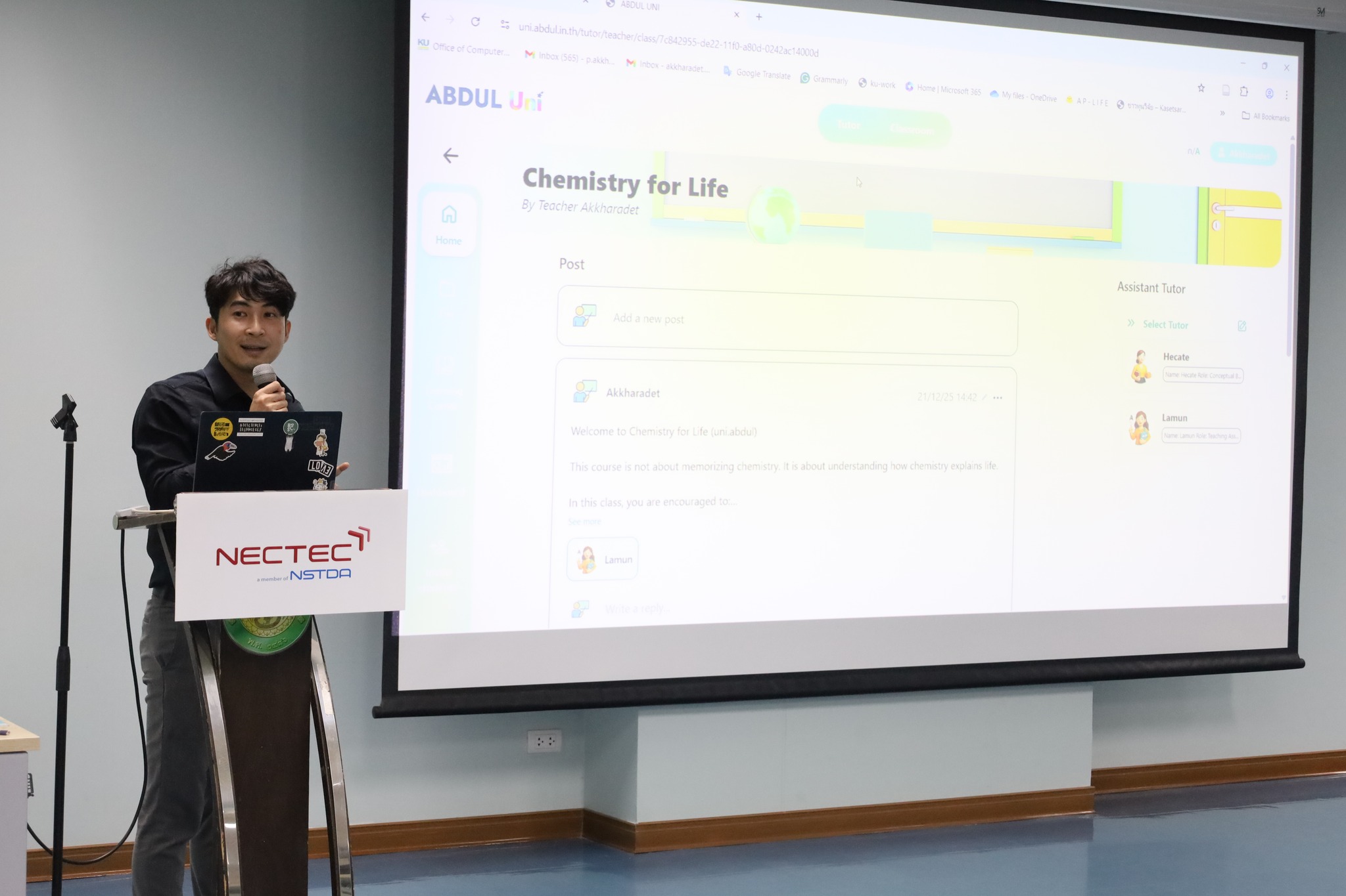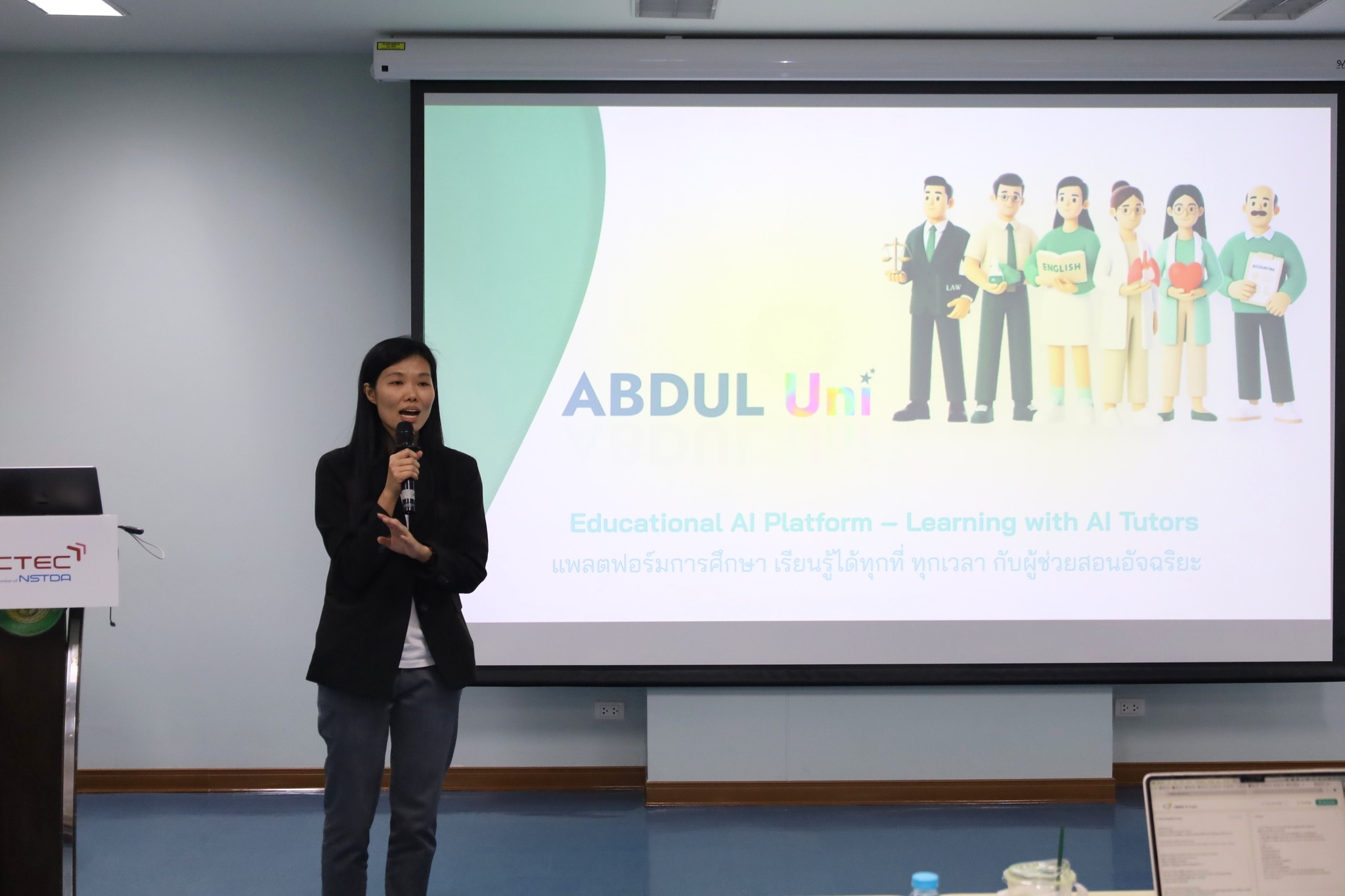 และกิจกรรม Workshop ที่เปิดโอกาสให้อาจารย์ได้ฝึกกระบวนการคิดออกแบบ (Design Thinking) ลงมือสร้างต้นแบบการเรียนการสอนของตนเองด้วย Abdul UNI: Educational AI Platform ซึ่งพัฒนาโดยทีมนักวิจัย เนคเทค สวทช. เพื่อช่วยสนับสนุนการออกแบบบทเรียน การดูแลผู้เรียนรายบุคคล และการจัดการเรียนการสอนอย่างเป็นระบบ โดย คณะนักวิจัย กลุ่มวิจัยปัญญาประดิษฐ์ เนคเทค สวทช. นำโดย คุณชัชวาล สังคีตตระการ, ดร.ศราวุธ คงยัง, คุณกนกอร ตระกูลทวีคูณ, คุณพาชิต สีเข้ม, คุณอานนท์ นามสนิท, คุณสุพล ไกลถิ่น และคุณวรพล ล้วนตั้งศรีสุข