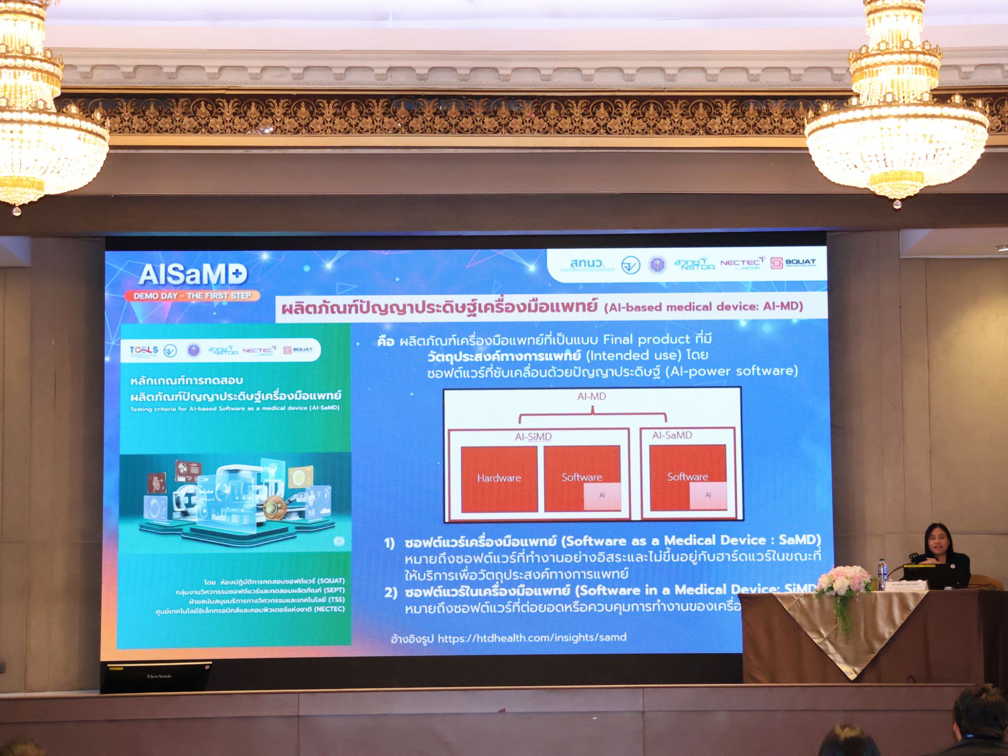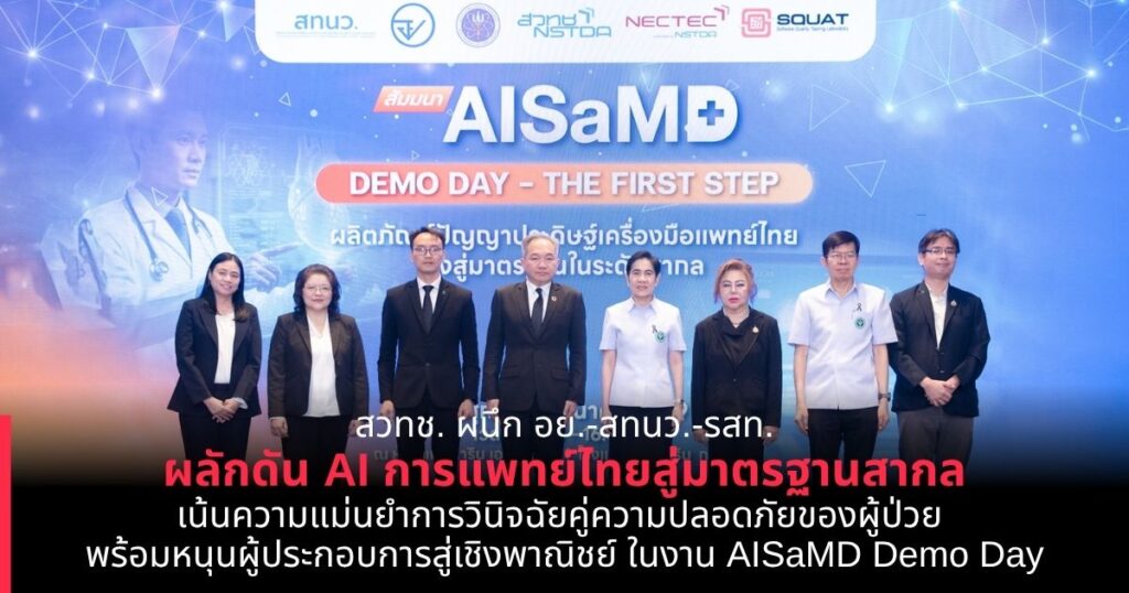 วันที่ 20 มีนาคม 2569 ณ โรงแรมแมนดาริน กรุงเทพฯ: กระทรวงการอุดมศึกษา วิทยาศาสตร์ วิจัยและนวัตกรรม (อว.) สำนักงานพัฒนาวิทยาศาสตร์และเทคโนโลยีแห่งชาติ (สวทช.) โดย ศูนย์เทคโนโลยีอิเล็กทรอนิกส์และคอมพิวเตอร์แห่งชาติ (เนคเทค) ร่วมกับ สำนักงานคณะกรรมการอาหารและยา (อย.) สำนักงานเทคโนโลยีและนวัตกรรมด้านชีววิทยาศาสตร์ (องค์การมหาชน) (สทนว.) และรังสีวิทยาสมาคมแห่งประเทศไทย (รสท.) จัด “AISaMD Demo Day: The first step ผลิตภัณฑ์ AI เครื่องมือแพทย์ไทย มุ่งสู่มาตรฐานในระดับสากล” ชูไฮไลต์ 5 ผลิตภัณฑ์ AI การแพทย์ที่ผ่านการทดสอบตามมาตรฐานสากล พร้อมประกาศลงนามความร่วมมือ 2 ฉบับสำคัญ ได้แก่ 1. การลงนามความร่วมมือด้านการวิจัยและพัฒนาการประเมิน ตรวจสอบ และทดสอบด้านสมรรถนะและความปลอดภัยของผลิตภัณฑ์เครื่องมือแพทย์รวมถึงเครื่องมือแพทย์ซอฟต์แวร์และปัญญาประดิษฐ์ ระหว่าง สทนว. สวทช. และ อย. และ 2.การลงนามความร่วมมือภายใต้โครงการพัฒนาหลักเกณฑ์และบริการทดสอบ สำหรับผลิตภัณฑ์ปัญญาประดิษฐ์เครื่องมือแพทย์ตามมาตรฐานสากล ระหว่าง เนคเทค-สวทช. และ รทส. เพื่อวางโครงสร้างพื้นฐานด้านการตรวจสอบและกำกับดูแลนวัตกรรมทางการแพทย์ของประเทศ