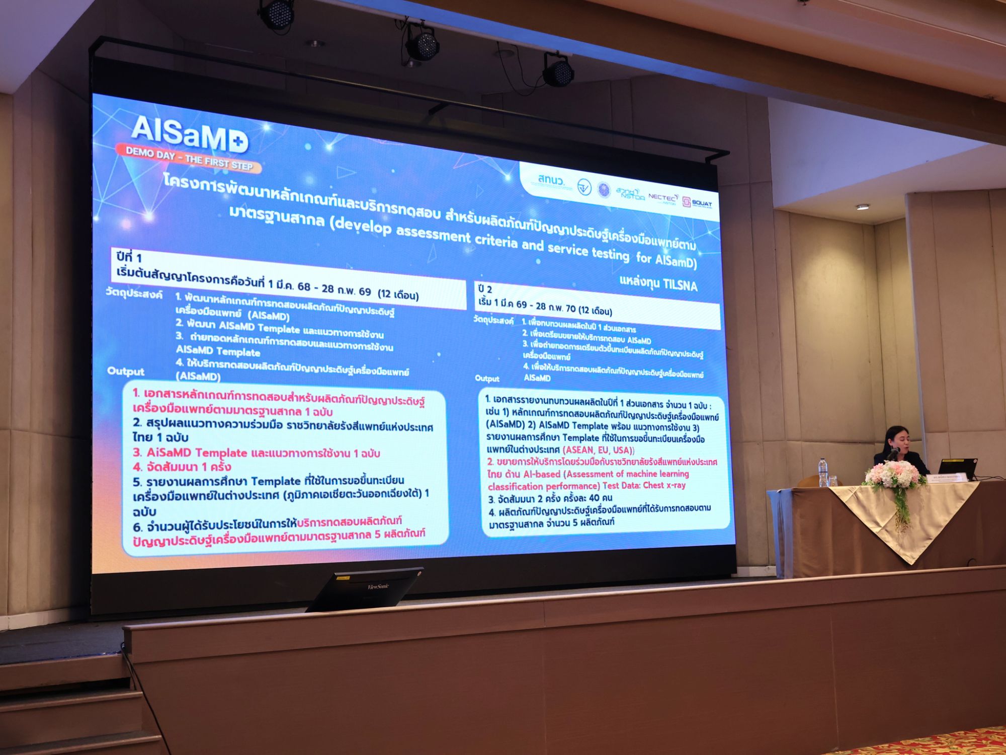 ดร.ชัย วุฒิวิวัฒน์ชัย ผู้อำนวยการเนคเทค สวทช. กล่าวว่า โครงการ AISaMD เกิดจากโจทย์ที่ท้าทายในการสร้างกลไกเร่งด่วนที่ปลอดภัยและได้มาตรฐานสากลให้กับนวัตกรรม AI ทางการแพทย์ของไทย ตลอด 1 ปีที่ผ่านมา เนคเทคได้สร้างโครงสร้างพื้นฐานทางเทคนิคที่ใช้งานได้จริงผ่านห้องปฏิบัติการทดสอบซอฟต์แวร์ SQUAT โดยมีการจัดทำหลักเกณฑ์ประเมินสมรรถนะและความปลอดภัย รวมถึง AISaMD Template ที่เปรียบเสมือนคัมภีร์ช่วยผู้ประกอบการลดระยะเวลาในการเตรียมเอกสารเทคนิคให้สอดคล้องกับข้อกำหนดของ อย. โดย เนคเทคยังคงเดินหน้าโครงการสู่ปีที่ 2 มุ่งยกระดับการทดสอบคุณภาพผลิตภัณฑ์ปัญญาประดิษฐ์เครื่องมือแพทย์ไทย ภายใต้การสนับสนุนงบประมาณจาก สทนว. และพันธมิตร อย. และ รสท. เพื่อปลดล็อกอุปสรรคให้ผู้ประกอบการไทยสามารถขออนุญาตขึ้นทะเบียน AI เครื่องมือแพทย์ จาก อย. ได้อย่างมั่นใจ