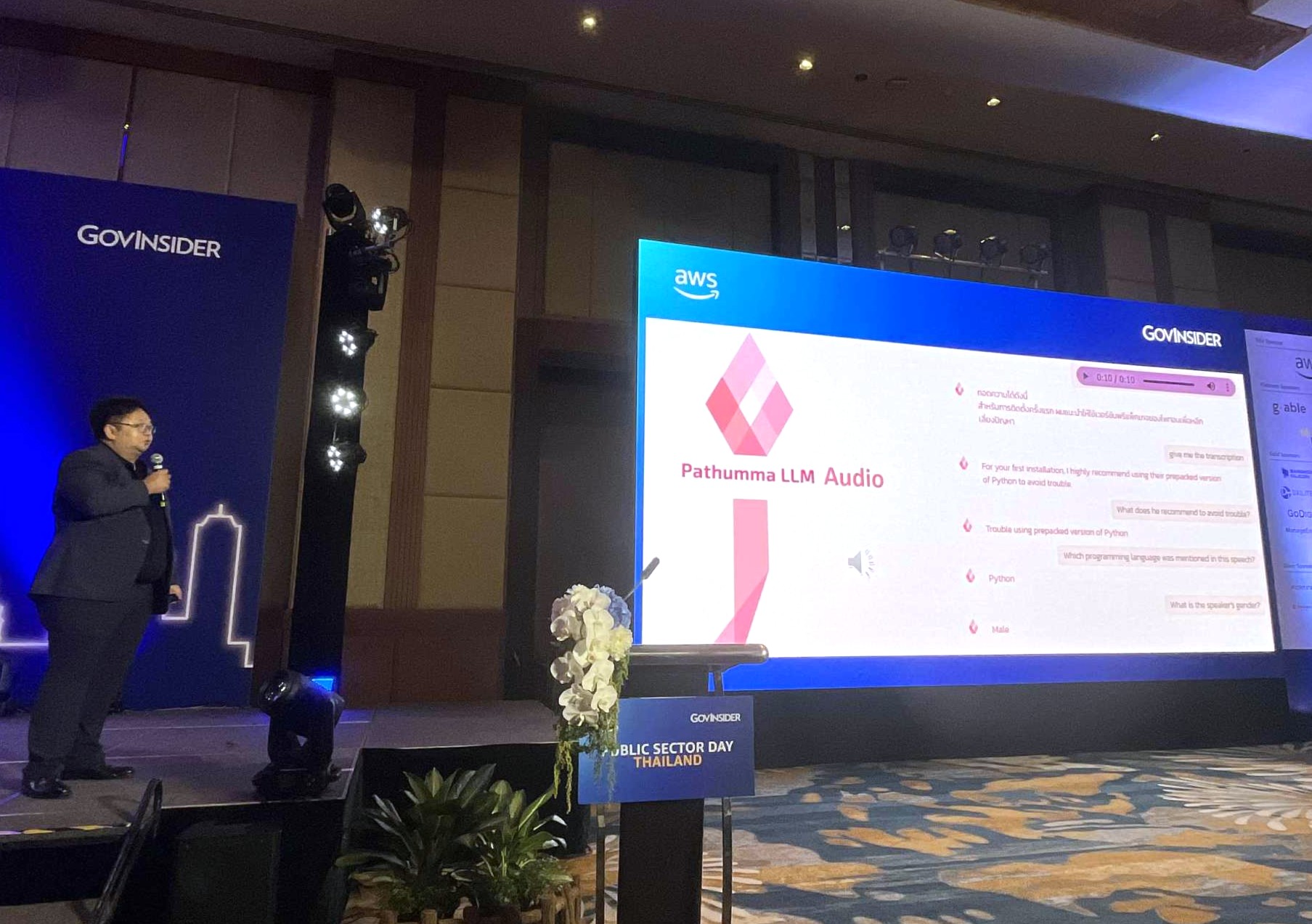 พร้อมกันนี้ ดร.ศราวุธ ยังได้ร่วมเปิดมุมมองชูบทบาทโมเดล AI ภาษาไทย เพื่อยกระดับบริการภาครัฐยุคดิจิทัล ผ่านการบรรยายหัวข้อ “AI for Public Sector used case by Pathumma LLM” เพื่อถ่ายทอดภาพรวมการประยุกต์ใช้ AI ในภาครัฐไทย ผ่านกรณีการใช้งานจริงของ Pathumma LLM ที่ปัจจุบันได้เริ่มนำร่องความร่วมมือพัฒนาบริการในหลายหน่วยงาน อาทิ ระบบถาม-ตอบ ข้อมูลภาคประชาชน สำนักงาน ก.พ.ร., ค้นหาข้อมูลวิจัยจาก ฐาน TNRR และ NRISS สำนักงานการวิจัยแห่งชาติ, สืบค้นสำนวน สรุปคำฟ้อง ถาม-ตอบข้อมูลศาลฎีกา, ถาม-ตอบข้อมูลภาษี กรมสรรพากร