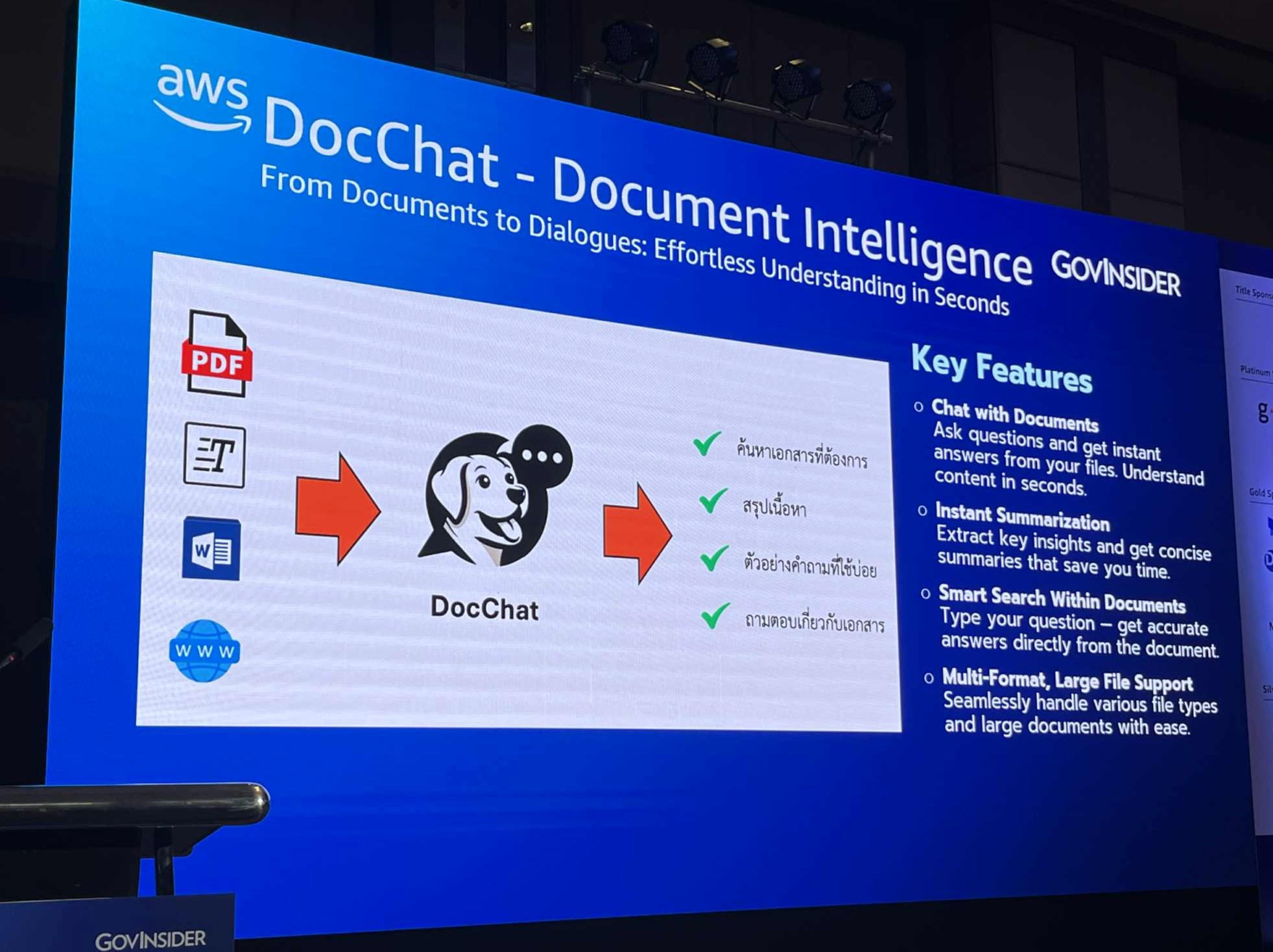 - DocChat: ผู้ช่วยค้นหาข้อมูลจากเอกสารหลายๆ หน้า ในรูปบบถาม-ตอบ ที่ผู้ใช้สามารถพูดคุย สอบถามข้อมูลที่ต้องการจากเอกสารได้โดยตรง รองรับเอกสาร Plain Text, .docx, .PDF, Website