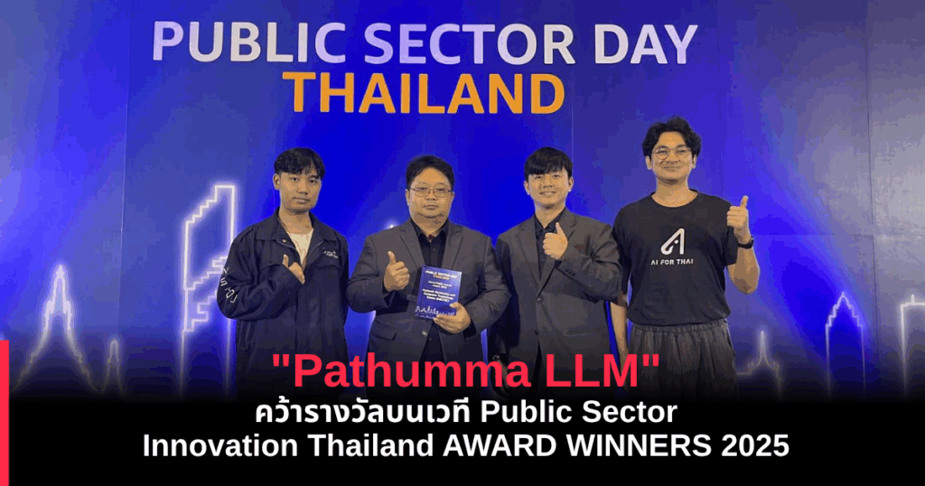ในโอกาสนี้ ผลงาน “Pathumma LLM” โมเดล AI สัญชาติไทย เพื่อคนไทย ที่พัฒนาโดยกลุ่มวิจัยปัญญาประดิษฐ์ เนคเทค สวทช. ได้รับรางวัล Public Sector Innovation Thailand 2025 ในสาขา “GenAI Public Impact” รางวัลแห่งการประยุกต์ใช้ปัญญาประดิษฐ์ยุคใหม่ สร้างสรรค์นวัตกรรมบริการที่ล้ำสมัยด้วย Generative AI ที่สามารถยกระดับการทำงานของหน่วยงานภาครัฐ เพื่อประโยชน์ของประชาชนและประเทศชาติได้อย่างแท้จริง โดยมี ดร.ศราวุธ คงยัง หัวหน้าทีมวิจัยการยกระดับปัญญาประดิษฐ์ ขึ้นรับมอบรางวัล