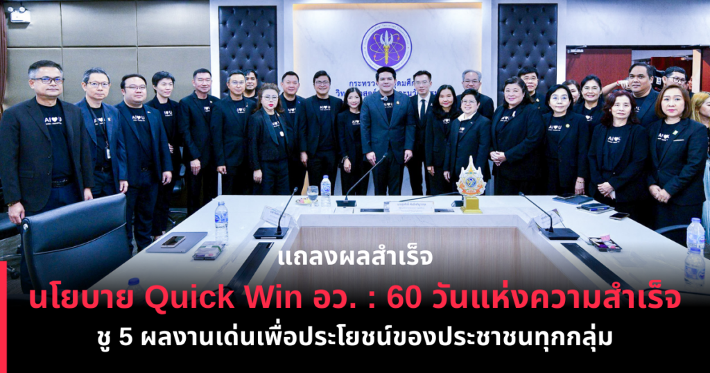 “สุรศักดิ์” แถลงผลสำเร็จนโยบาย Quick Win อว. : 60 วันแห่งความสำเร็จ ชู 5 ผลงานเด่น “โดรนคนละครึ่งพลัส – วิทย์พิชิตภัยช่วยน้ำท่วมใต้ – มหาวิทยาลัยสีเขียว – Upskill-Reskill ช่วยคนตกงาน – AI love U เร่งพลังอนาคตไทย” ชี้เพื่อประโยชน์ของพี่น้องประชาชนทุกกลุ่ม