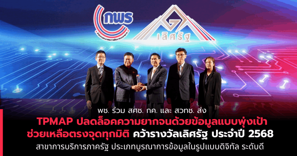 พช. ร่วม สศช. กค. และ สวทช. ส่ง “TPMAP ปลดล็อคความยากจนด้วยข้อมูลแบบพุ่งเป้าช่วยเหลือตรงจุดทุกมิติ” คว้ารางวัลเลิศรัฐ ประจำปี 2568 สาขาการบริการภาครัฐ ประเภทบูรณาการข้อมูลในรูปแบบดิจิทัล ระดับดี