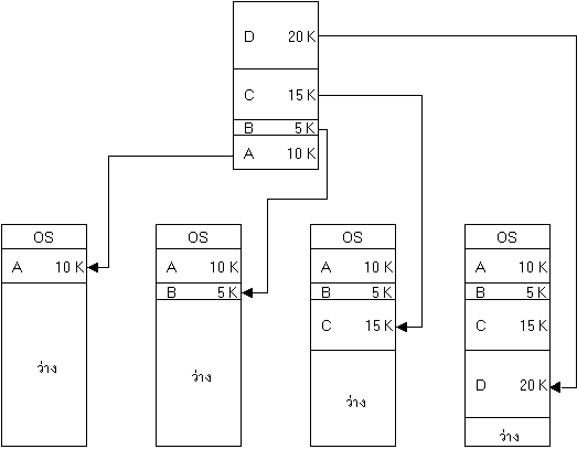 ผู้ออกแบบระบบ OS ได้ตระหนักถึงข้อเสียของการแบ่งหน่วยความจำขนาดคงที่ จึงคิดว่า ควรปรับปรุงการแบ่งหน่วยความจำให้ดีขึ้น เขาจึงเปลี่ยนวิธีแบ่งหน่วยความจำใหม่คือ OS จะ ยินยอมให้โปรแกรมครอบครองหน่วยความจำมากเท่าที่ต้องการ ไม่มีการจำกัด วิธีการนี้เรียก ว่า การแบ่งหน่วยความจำขนาดไม่คงที่ ดังรูปที่แสดง