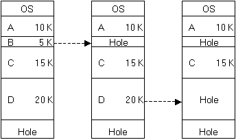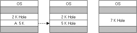 การรวมโฮล เมื่อมีโฮล 2 โฮลติดกันในหน่วยความจำ OS ควรมีความสามารถที่จะรวมโฮลทั้ง 2 นี้เป็นโฮลใหญ่เดียว เรียกว่า การรวมโฮล (Coalescing Holes) ดังรูปที่แสดง