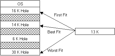 ยุทธวิธีการวาง เมื่อโปรแกรมใหม่ถูกส่งมาในระบบหน่วยความจำมีโฮลเกิดขึ้นกระจายไปทั่ว เราควร จะวางโปรแกรมใหม่นี้ลงบนโฮลไหนดี การตัดสินใจขึ้นอยู่กับ "ยุทธวิธีการวาง" (Placement strategy) ซึ่งมีอยู่ 3 ประเภทคือ 1. เลือกโฮลที่พบก่อน (first - fit) OS จะทำการตรวจค้นโฮลต่างๆ ในหน่วยความจำ เมื่อใดที่มันพบโฮลที่มีขนาดใหญ่พอ ที่จะ วางโปรแกรมใหม่นี้ลงไปมันจะเลือกเอาโฮลนั้น ซึ่งทำให้การเลือกโฮลทำได้รวดเร็ว 2. เลือกโฮลที่เหมาะสมที่สุด (Best - fit) OS จะตรวจสอบโฮลต่างๆ ทั้งหมดที่มีอยู่ในหน่วยความจำ แล้วเลือกเอาโฮลที่เมื่อวาง โปรแกรมเข้าไปแล้วเกิดโฮลขนาดเล็กที่สุด 3. เลือกโฮลที่ใหญ่ที่สุด (Worst - fit) การเลือกโฮลแบบนี้จะตรงข้ามกับแบบที่ 2 OS จะเลือกเอาโฮลที่เมื่อวางโปรแกรมใหม่ ลงไปแล้วจะเกิดโฮลขนาดใหญ่ที่สุด หรืออีกนัยหนึ่งเลือกโฮลที่มีขนาดใหญ่ที่สุด นั้นเอง ผู้ที่คิด วิธีนี้ให้เหตุผลว่า การทำเช่นนี้สามารถลดโอกาสที่เกิดโฮลขนาดเล็กๆ