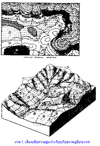 แผนที่ภูมิประเทศเป็นแผนที่ที่ระบุสิ่งที่สำคัญไว้หลายประการ เช่น ระบุตำแหน่งที่ตั้งหมู่บ้าน ตำบล อำเภอ และจังหวัด ระบุตำแหน่งเส้นทางการไหลของน้ำตั้งแต่ลำธารสายเล็ก จากพื้นที่ต้นน้ำบนภูเขาสูงมาสู่ลำธารสายใหญ่ขึ้น จนกระทั่งมาบรรจบกันเป็นแม่น้ำ ระบุเส้นทางคมนาคมตั้งแต่ทางเดินเท้า ทางเกวียน ถนนไม่ลาดยาง จนถึงทางหลวงจังหวัด และทางหลวงแผ่นดิน แต่สิ่งที่ขาดไม่ได้สำหรับแผนที่ภูมิประเทศ คือ เส้นชั้นความสูง หรือเส้นคอนทัวร์ (Contour Lines) หรือเส้นระดับความสูงเท่ากัน เส้นเหล่านี้มีลักษณะเป็นเส้นโค้งต่อเนื่องมีตัวเลขระดับความสูงกำกับไว้ชัดเจน เช่น เส้นที่กำหนดความสูงไว้ 1,000 หมายความว่า ทุก ๆ จุดที่อยู่บนเส้น 1,000 มีระดับความสูงเท่ากันที่ระดับความสูง 1,000 เมตรจากระดับน้ำทะเลปานกลาง (ภาพ 1.)