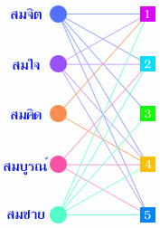 สมจิต สมใจ สมคิด สมบูรณ์ และสมชาย เป็นบุคคลที่ได้รับการจัดสรรให้ทำงาน ซึ่งมีงานทั้นสิ้นห้างานคือ 1, 2, 3, 4 และ 5