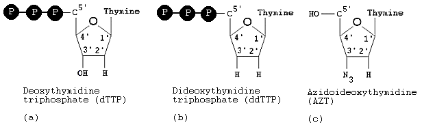 ยาตัวแรกที่ใช้ต่อต้านโรคเอดส์มี dideoxynucleoside เป็นส่วนประกอบซึ่งมี dideoxycytidine (ddc), dideoxyinosine (ddI) (inosine เป็นตัวเริ่มต้นของ purine ซึ่งใช้ในการสังเคราะห์ DNA คือ A และ G) ส่วนยาอีกตัวหนึ่งคือ AZT (zidovudine) ซึ่งเป็น dideoxythymidine ที่มีหมู่ N3 เข้าแทนหมู่ OH ที่ตำแหน่ง 3' ดังรูป