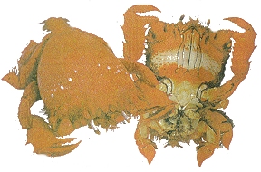 มีขาสีน้ำตาลค่อนข้างรอบขอบกระดอง เพศผู้จะเห็นชัดเจนลำตัวกับขาเดินมีสีส้มอมแดง