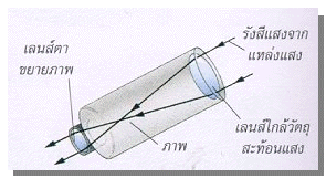 ทำด้วยกล้องที่ยาวซึ่งมีเลนส์แก้วจำนวนหนึ่ง แสงจากภาพจะเข้าไปยังเลนส์ที่ใหญ่ที่สุดในตอนท้ายของกล้องแสงทั้งหมดจะมารวมกันอยู่ภายในกล้องตามรูปร่างของเลนส์ภายหลังผ่านเลนส์ในกล้องแล้ว ภาพก็จะถูกโฟกัสไปยังตาของผู้สังเกต