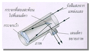 ไม่ได้ใช้เลนส์เพื่อโฟกัสแสงแต่จะใช้กระจกโค้งที่ตอนท้ายของกล้องเพื่อสะท้อนแสงไปยังกระจกแบบราบเล็ก กระจกแบบราบจะสะท้อนแสงออกมาทางด้านข้างของกล้องมาสู่ตา