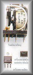 ถึงแม้จะไม่ใช่เครื่องขยายแท้ ๆ ก็ตาม แต่รีเลย์ก็นำไปใช้เป็นสะพานไฟให้กับกระแสขนาดใหญ่ หรือในกรณีที่เล็กกว่าก็ใช้เป็นตัวตัดต่อสัญญาณเครื่องขยายในรูปแบบของวงจรเบ็ดเสร็จ ทำงานได้ หลายหน้าที่ เครื่องขยายเสียงสามารถจ่ายกำลังไฟให้กับลำโพงที่ทนได้สูงกว่า 20 วัตต์ มีการใช้งาน เครื่องขยายชนิดออปเปอเรชันนัล (operational amplifier) กันอย่างกว้างขวางในวงจรเชิงอุปมาน กำลังต่ำ ส่วนประกอบที่แสดงอยู่ด้านบนนี้มีขนาดเท่าของจริง |