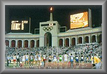 เห็นนักวิ่งยืนเรียงแถว เตรียมตัวเริ่มออกวิ่งมาราทอนในการแข่งขันโอลิมปิกที่ลอสแอง