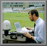 สถานีดาวเทียมของนักหนังสือพิมพ์เครื่องนี้เชื่อมโยงกับคอมพิวเตอร์ของเขาต่อเข้าไปยัง