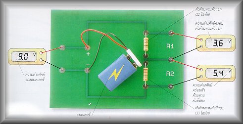 ความต่างศักย์ที่แตกต่างกันออกไป วงจรตัวแบ่งศักย์ใช้เพื่อแบ่งความต่างศักย์ขนาดใหญ่ออกเป็น ความต่างศักย์ย่อย ๆ ความต่างศักย์คร่อมตัวต้านทานทุกตัวรวมกันแล้วจะเท่ากับความต่างศักย์ของแบตเตอรี่ (ในที่นี้คือ 9 โวลด์) แต่การที่มีตัวต้านทาน 2 ตัวจึงแยกความต่างศักย์ออกเป็น 2 ส่วนให้มีขนาดเล็กลง แต่มีสัดส่วนเป็นไปตามค่าของตัวต้านทานทั้งสอง บางครั้งเราเรียกตัวแบ่งศักย์ว่า โพเทนซิออมิเตอร์ (potentiometer) |