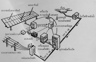 จะตอบสนองความต้องการการของมนุษย์ พลังงานแสงอาทิตย์เป็นพลังงานที่สะอาด ไม่ก่อให้เกิด มลพิษต่อสิ่งแวดล้อมของโลก เซลล์แสงอาทิตย์เป็นสิ่งประดิษฐ์ทางอิเล็กทรอนิกส์ที่นำมาใช้เพื่อ เปลี่ยนพลังงานแสงอาทิตย์เป็นพลังงานไฟฟ้า ทำจากสารกึ่งตัวนำ เช่น ซิลิคอน เจอร์เมเนียม และสารอื่น ๆ เมื่อเซลล์แสงอาทิตย์ได้รับแสงอาทิตย์ จะทำให้เกิดกระแสไฟฟ้าไหลในวงจรได้ พลังงานไฟฟ้าที่ผลิตได้จะเป็นไฟฟ้ากระแสตรง ซึ่งจะถูกส่งผ่านเครื่องแปลงกระแสไฟฟ้าแปลง ให้เป็นไฟฟ้ากระแสสลับโดยตรง หรืออาจจะเก็บไว้ในแบตเตอรี่ที่ต่อเข้าด้วยกันจำนวนหลายลูก ที่มีความจะประมาณ 480 แอมแปร์-ชั่วโมง มีแรงดัน 240 โวลต์ ก่อนที่จะทำการแปลงไฟฟ้า กระแสตรงให้เป็นไฟฟ้ากระแสสลับแล้วผ่านหม้อแปลงไฟฟ้าออกมาใช้งาน ในรูปแสดงระบบการผลิตพลังงานไฟฟ้าจากพลังงานแสงอาทิตย์ร่วมกับพลังงานน้ำ |