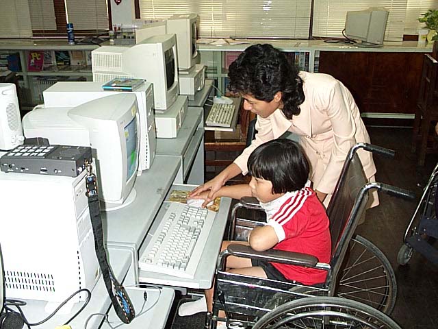 II. IT for the Disabled Persons Program, aims to demonstrate and provide public understanding about the use of IT applications to develop independent living and learning skill, to improve the quality of life, and to enhance education and job opportunity for the disabled persons, which constitute more than 2% of the Thai population. There are two main activities, i.e., provision of necessary IT equipment and devices for use in schools and disability-related agencies to enhance education and quality of life of children and youth with disabilities, and Research & Development (R&D) on Assistive Technology. Several PCs, devices and/or products have been sought from various sources, both in and outside the country and pilot tested to assess their use at Srisangwal School, which is one of the largest schools for physically handicapped children in the country, established under the initiative of the Princess Mother. Examples of the devices/products that were given to school are: Speech Viewer for people with speech impairment, easy balls (large mouse for physically handicapped), various kinds of switches to help the handicapped access to the information, Intellitools, etc. The IT Project staffs also work with various authorities that deal with disabled persons so that they see and understand the use of technologies and can integrate technologies into their respective program.
